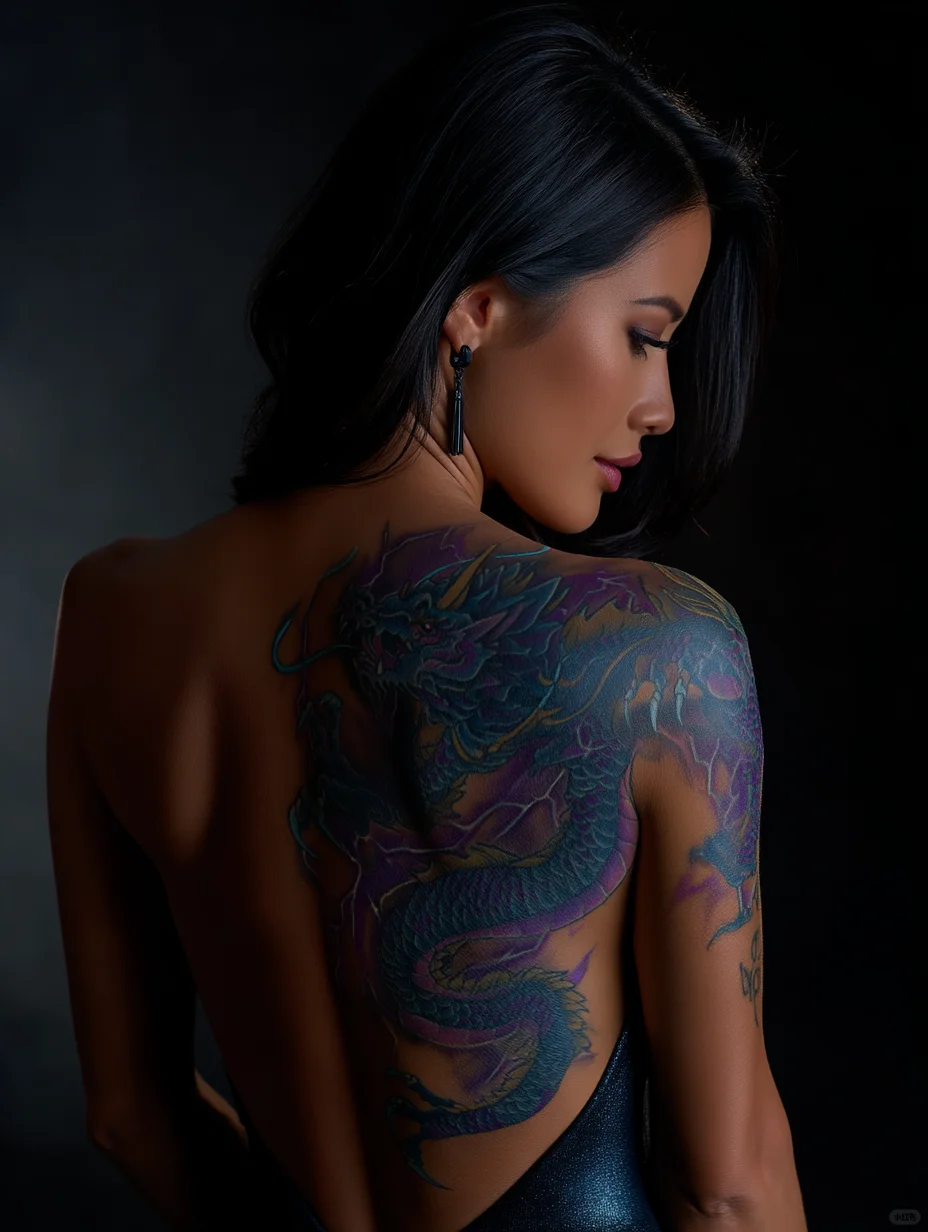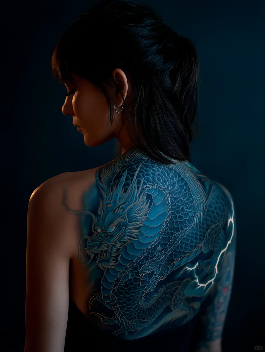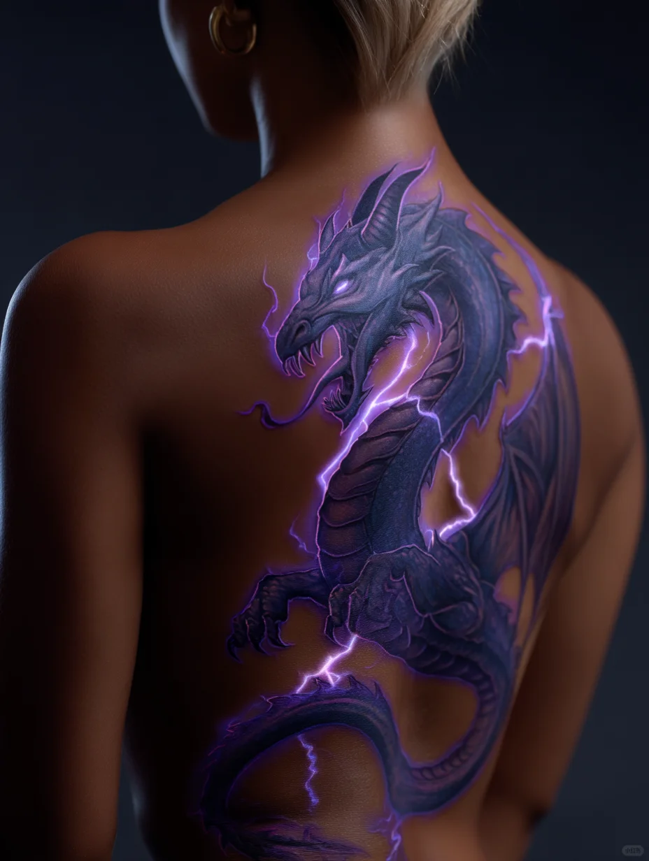 这幅戏剧张力十足的肖像,把女性的背当作最极致的画布。 纹身取自《山海经》的异兽——夔。它肌肉虬结,长角怒吼,闪电如霓虹紫与电蓝色的利刃,从肩膀延伸到脊柱,仿佛把力量直接刻进了血肉。 电光爆裂的对称性,不仅让肌肉线条更显张力,也让她的存在感像舞台上的唯一主角。