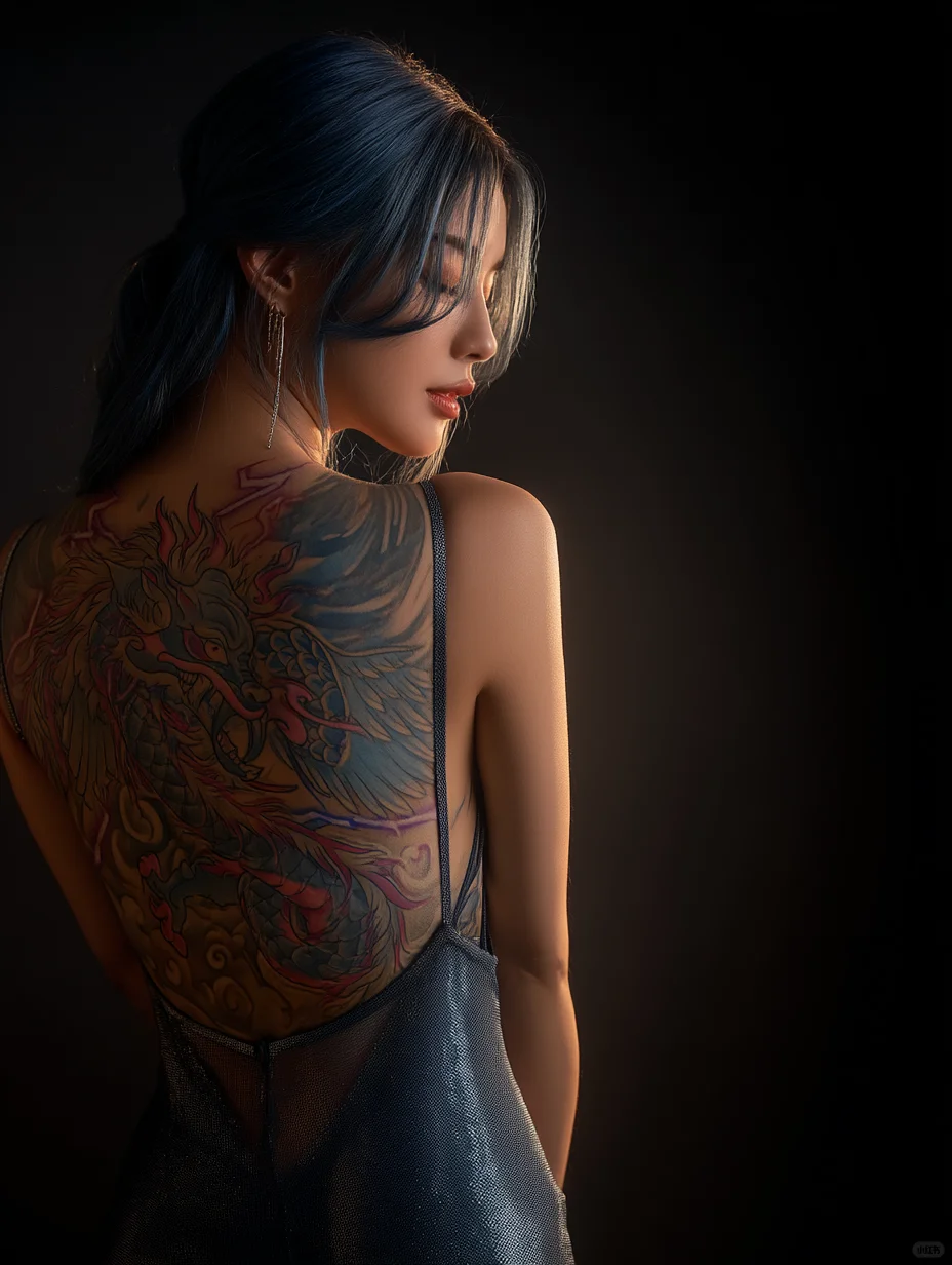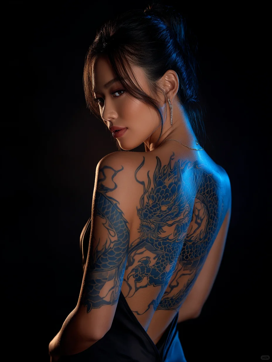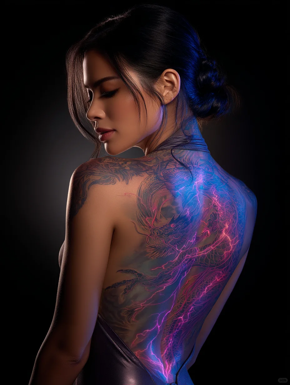 这幅戏剧张力十足的肖像,把女性的背当作最极致的画布。 纹身取自《山海经》的异兽——夔。它肌肉虬结,长角怒吼,闪电如霓虹紫与电蓝色的利刃,从肩膀延伸到脊柱,仿佛把力量直接刻进了血肉。 电光爆裂的对称性,不仅让肌肉线条更显张力,也让她的存在感像舞台上的唯一主角。