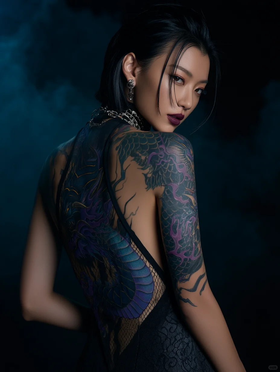 近看,每一道墨色的底纹、金属质感的角爪、细微的电弧噼啪声,都让纹身像是“活着”的。 在昏暗的背光和哥特式电影氛围中,她的身影冷峻、优雅,既真实又超现实。