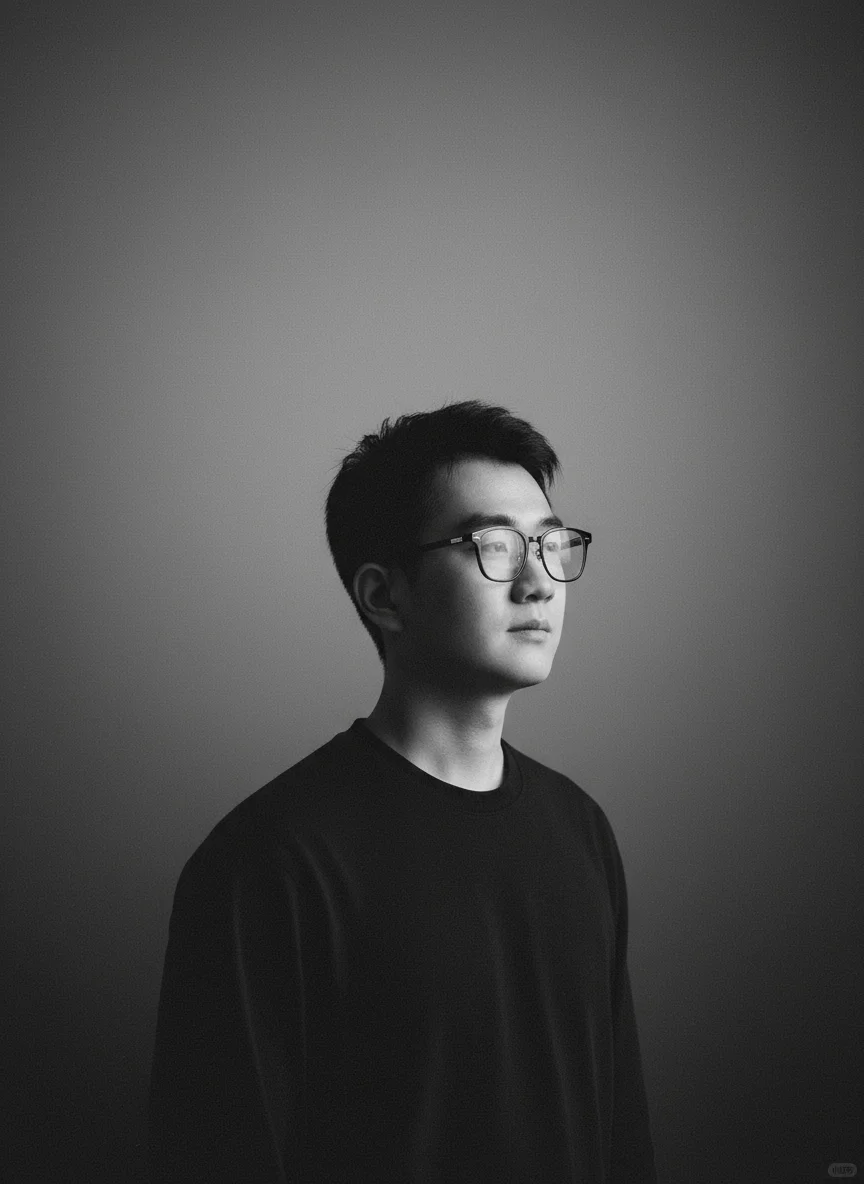 3.采用柔和的定向光源照亮画面,轻轻勾勒面部轮廓,眼部需带有淡淡的高光作为情感焦点。画面其余部分遵循极简主义与留白原则,保持构图简洁通透。
