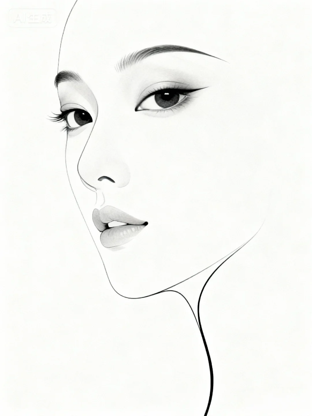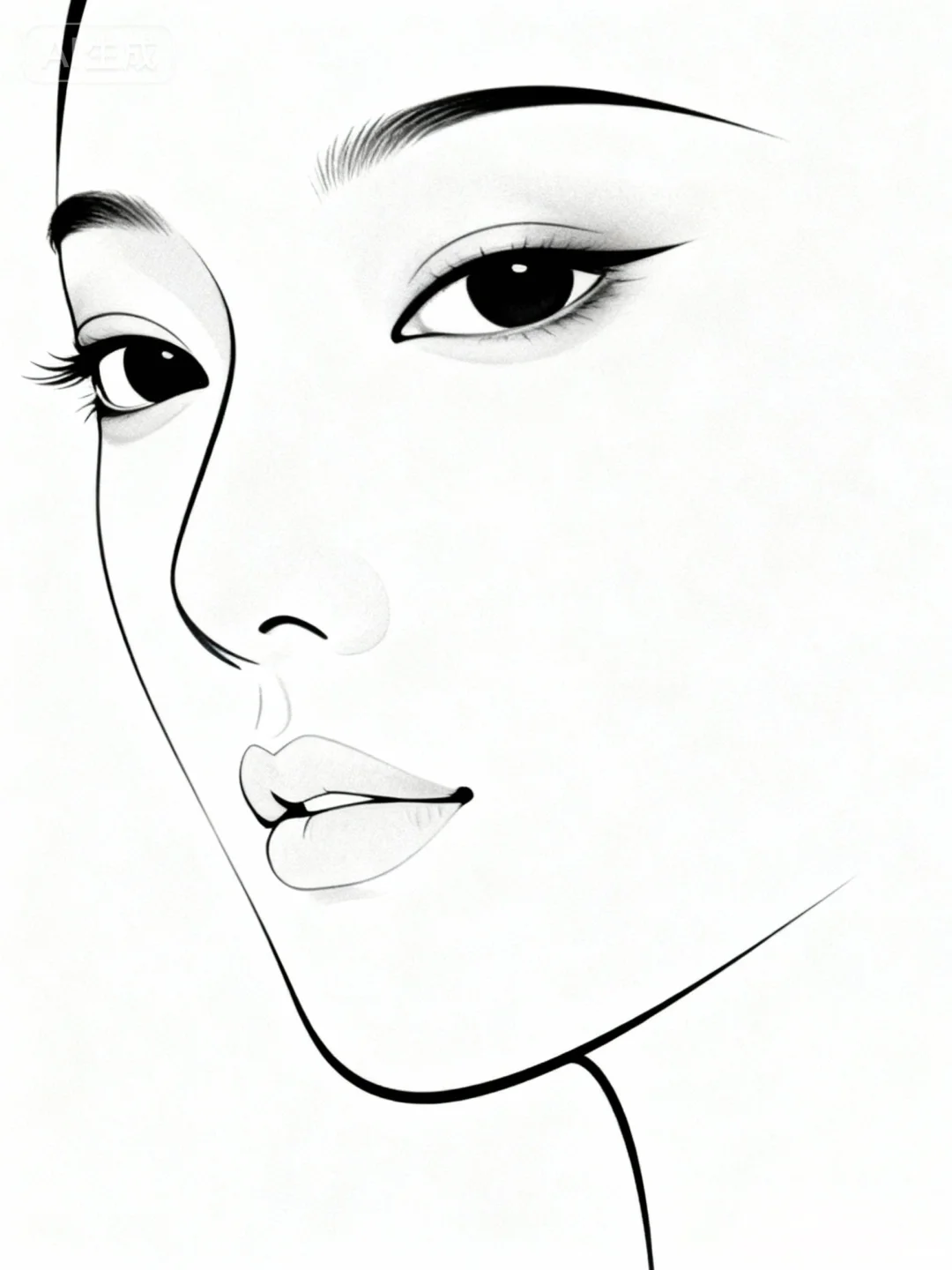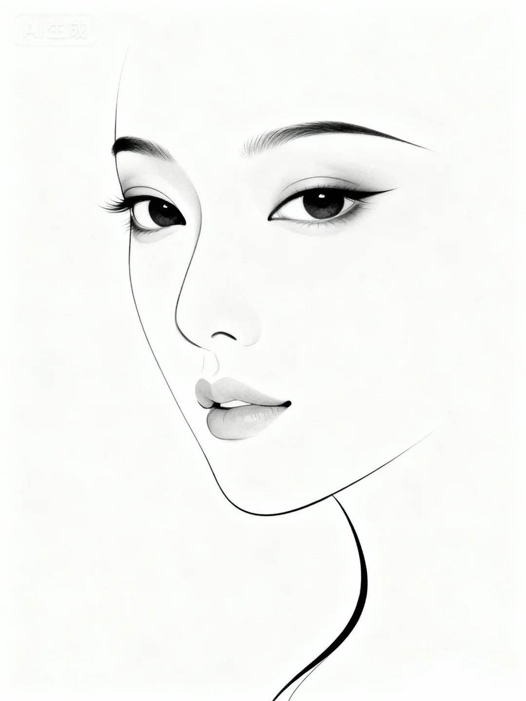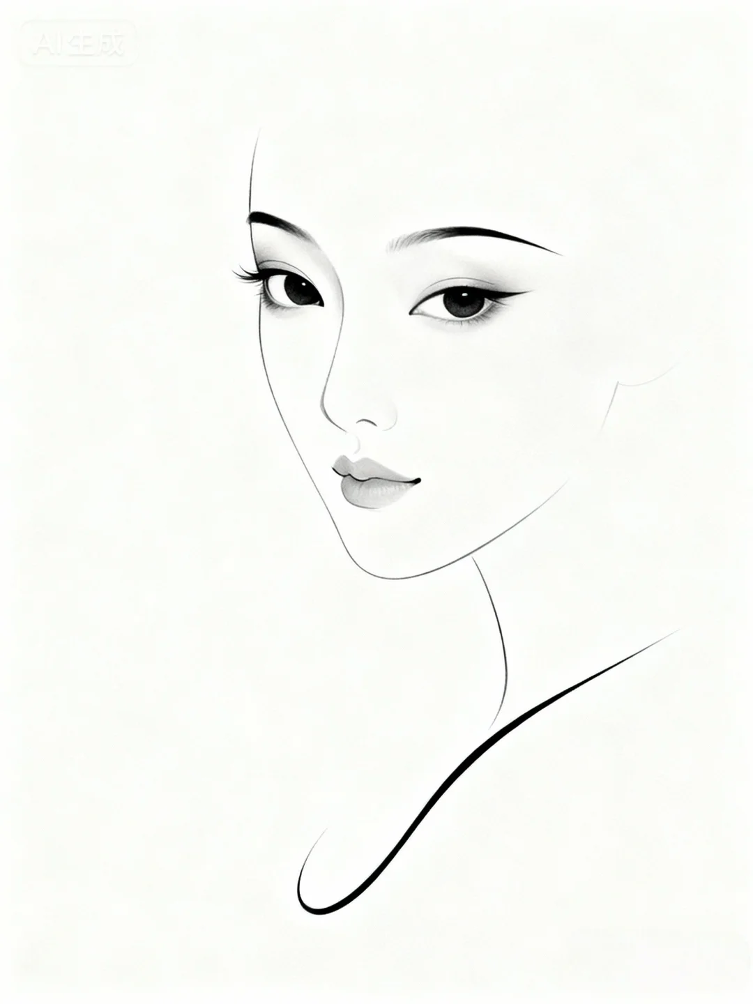 一根线条勾勒中国美女脸部曲线,极简构图,柔美,千娇百媚,漂亮的大眼睛,大面积留白