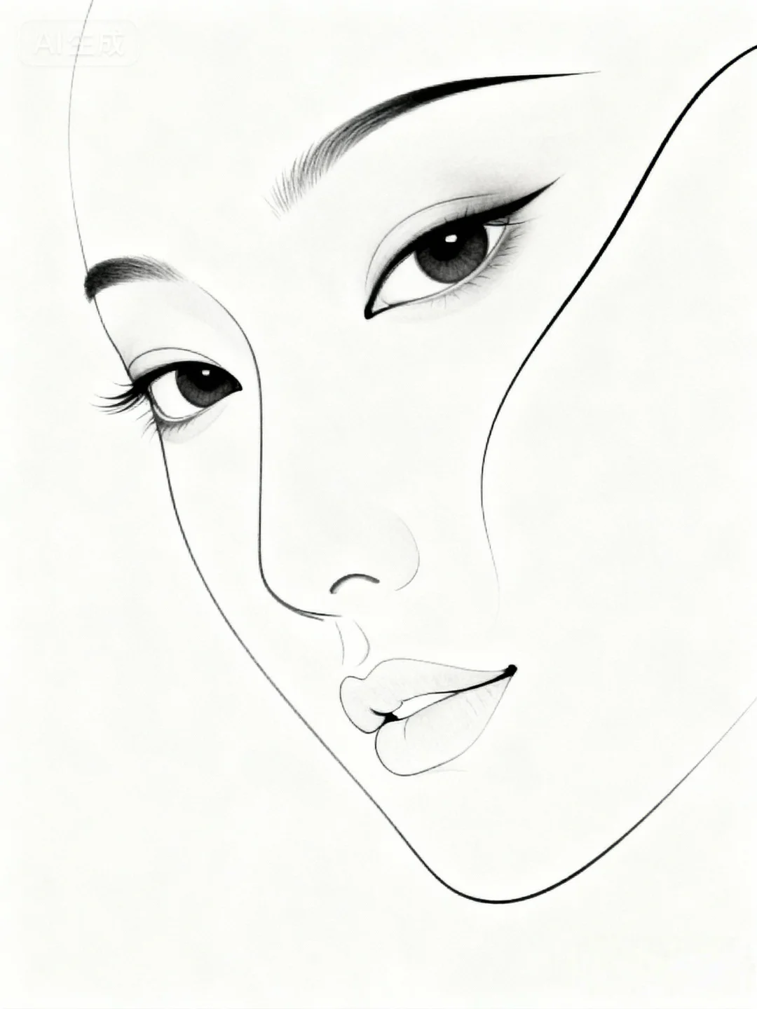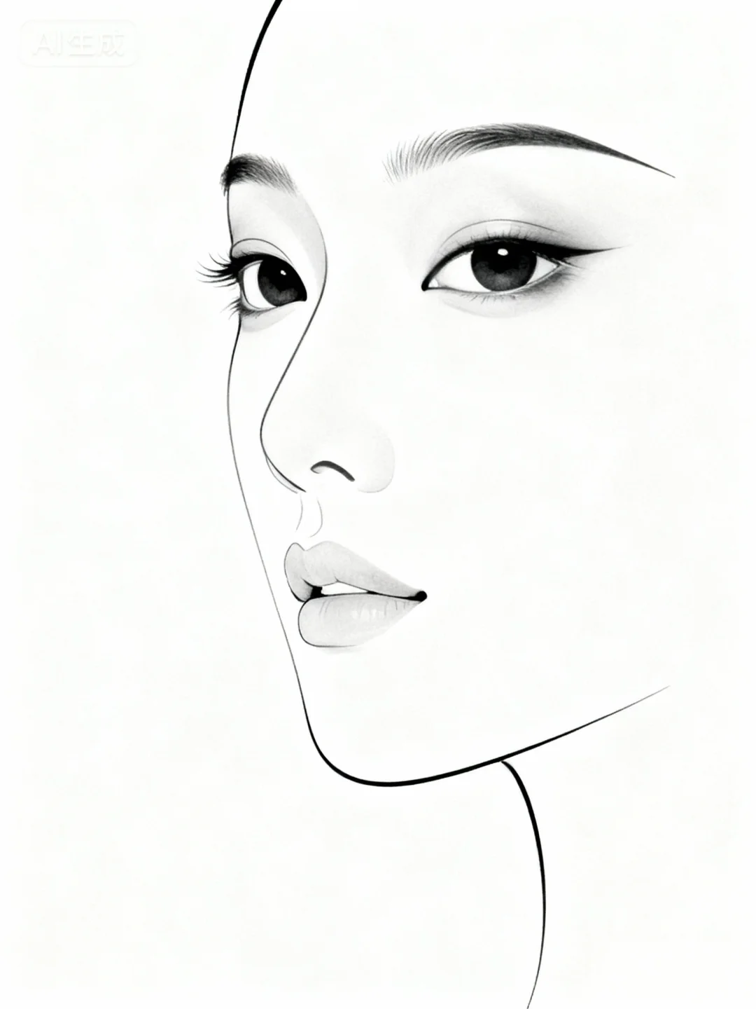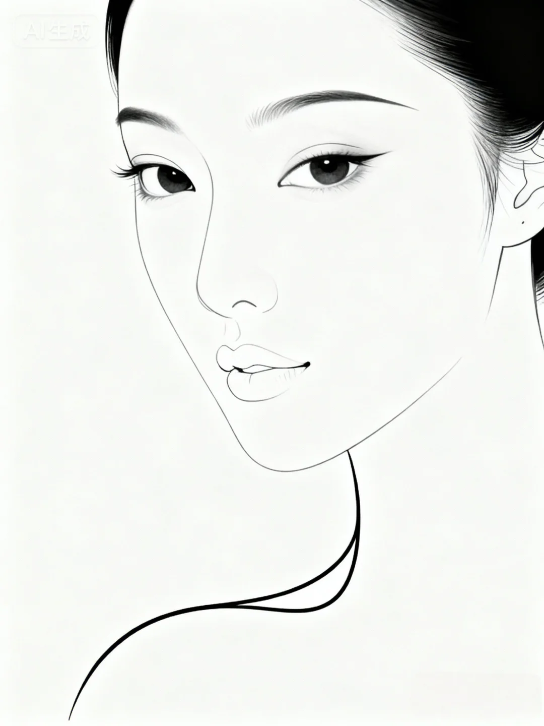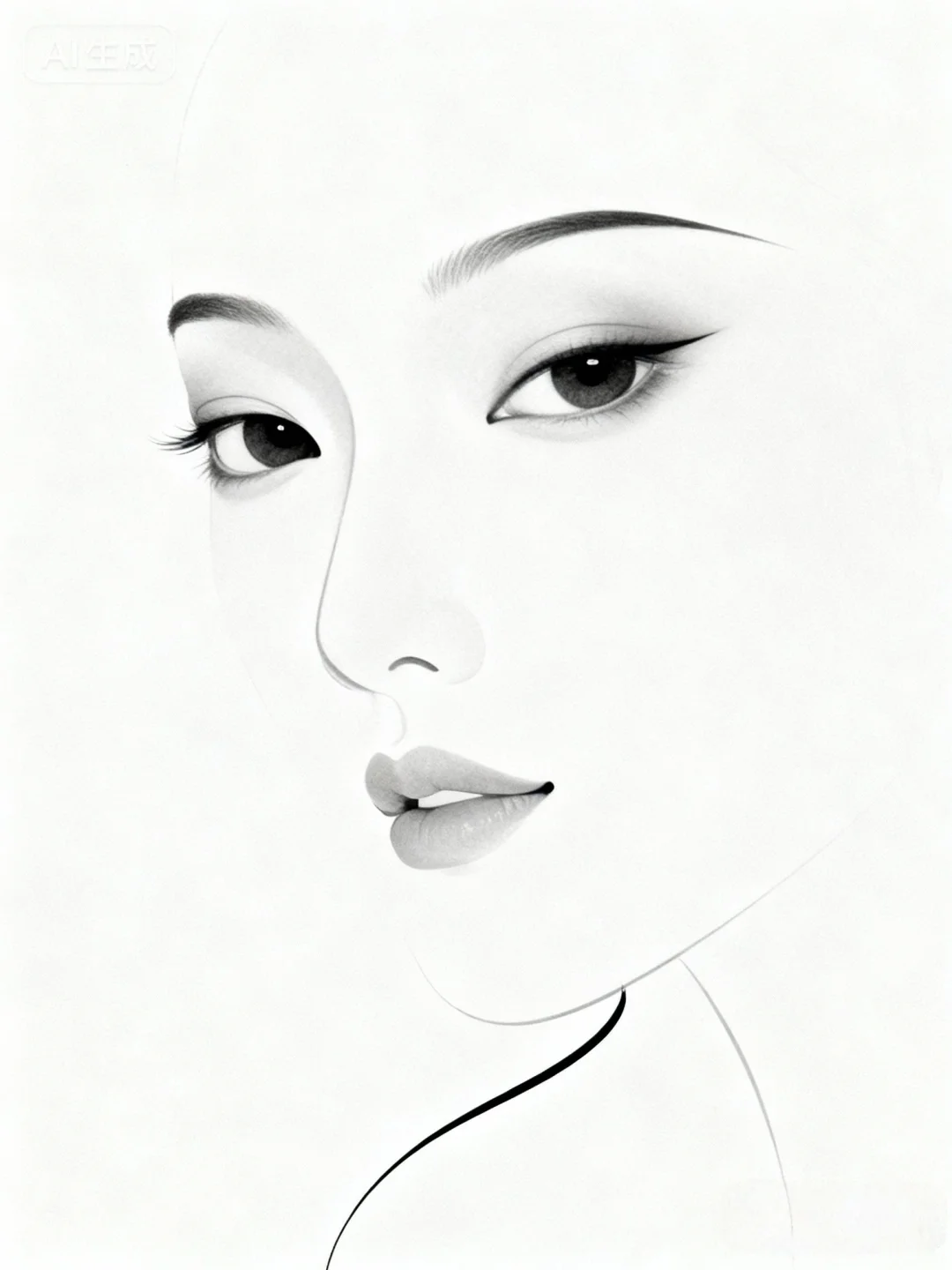 一根线条勾勒中国美女脸部曲线,极简构图,柔美,千娇百媚,漂亮的大眼睛,大面积留白