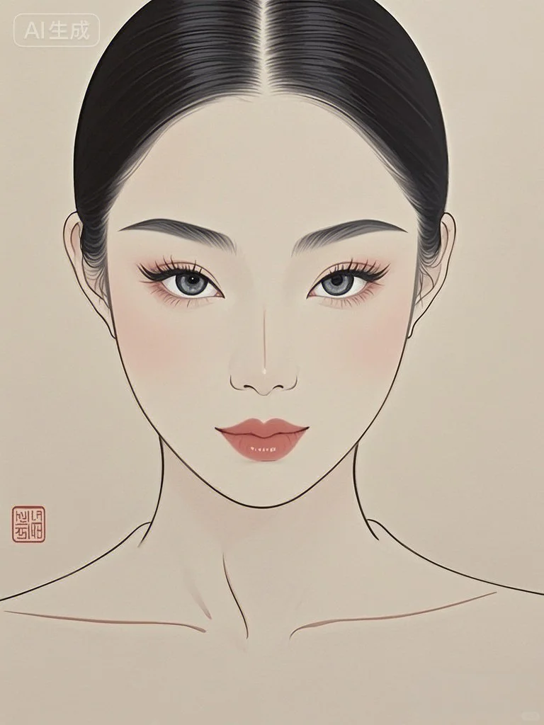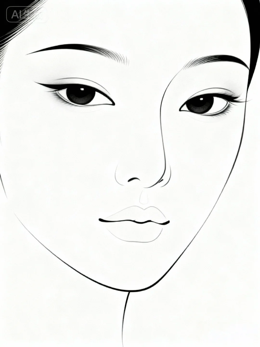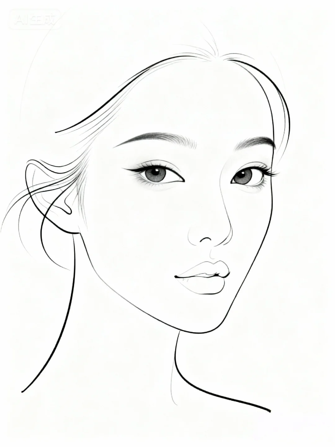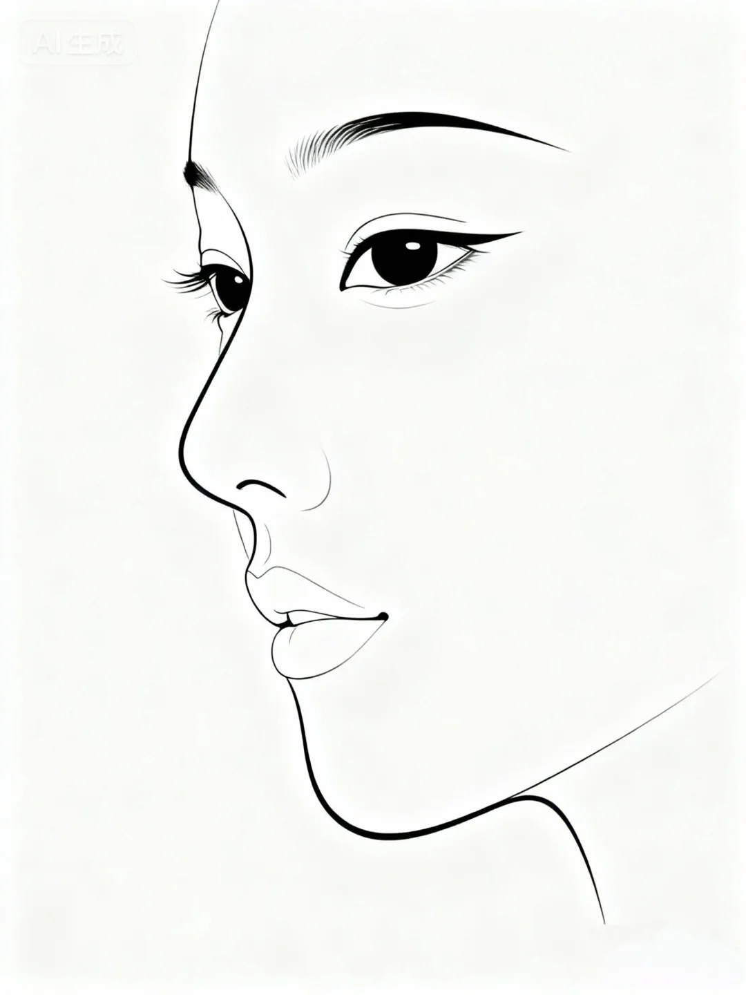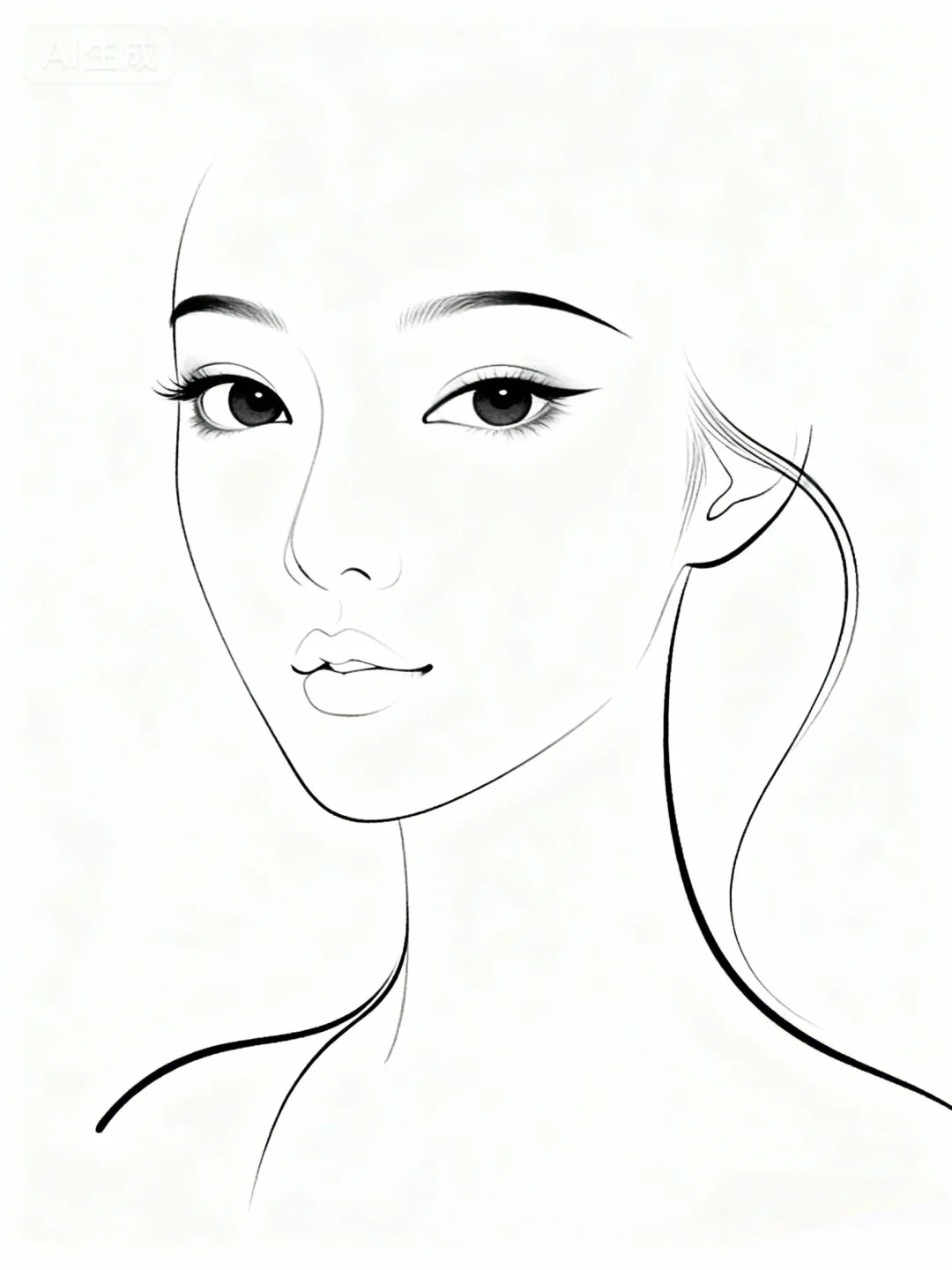 一根线条勾勒中国美女脸部曲线,极简构图,柔美,千娇百媚,漂亮的大眼睛,大面积留白