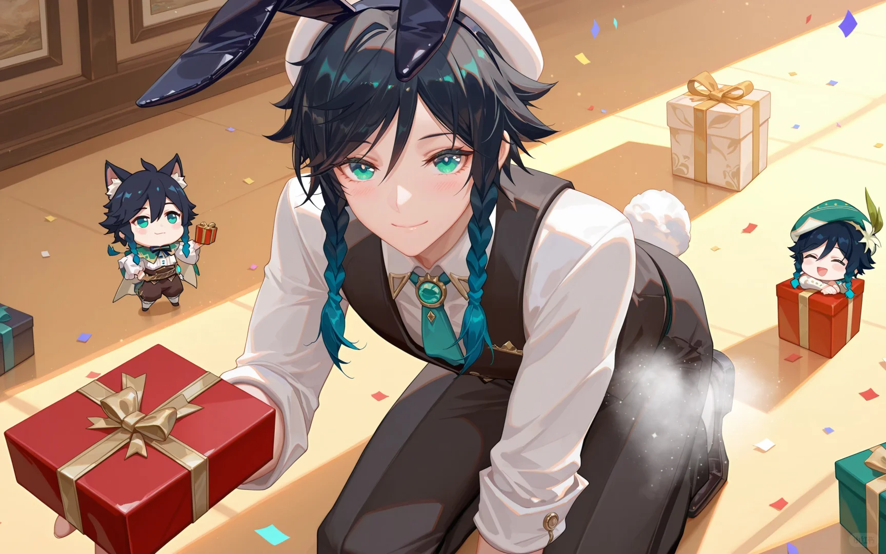 今早竟戴兔耳捧礼盒眨眼: