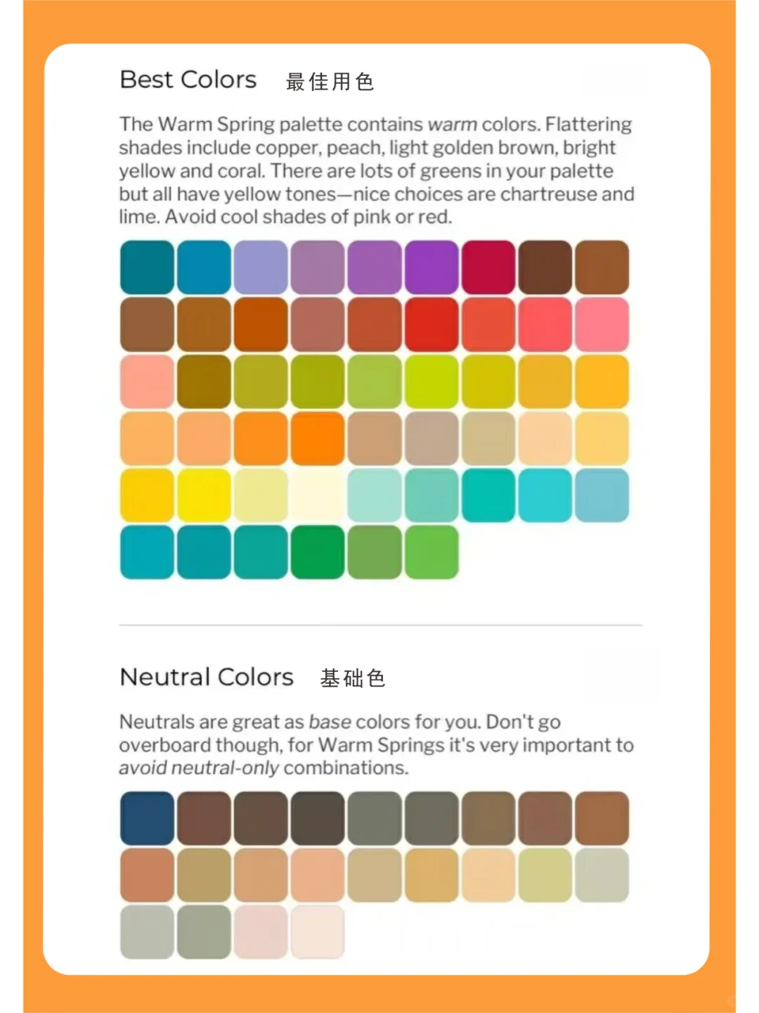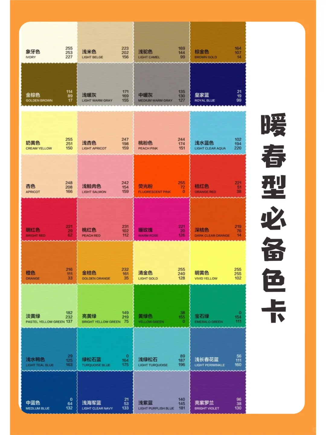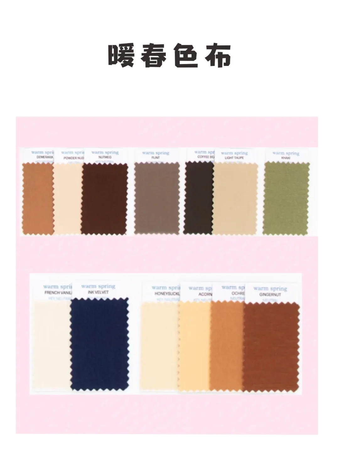 最后附上暖春色卡,买衣服选不定颜色的时候可以拿出色卡来对照看看,如果不确定自己的色彩季型,也可以根据色卡上的颜色来做进一步的诊断,记得下载保存好,肯定用得上。