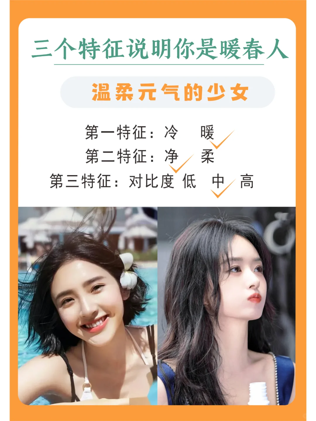暖春型人特征:肤色从浅白到中等深度,没有太深暗的肤色,肤质相对感觉较薄、通透。有些暖春型人隐隐带有一些红晕,所以皮肤往往莹白透粉,很细嫩。眼睛的颜色从黄褐色到黑褐色。