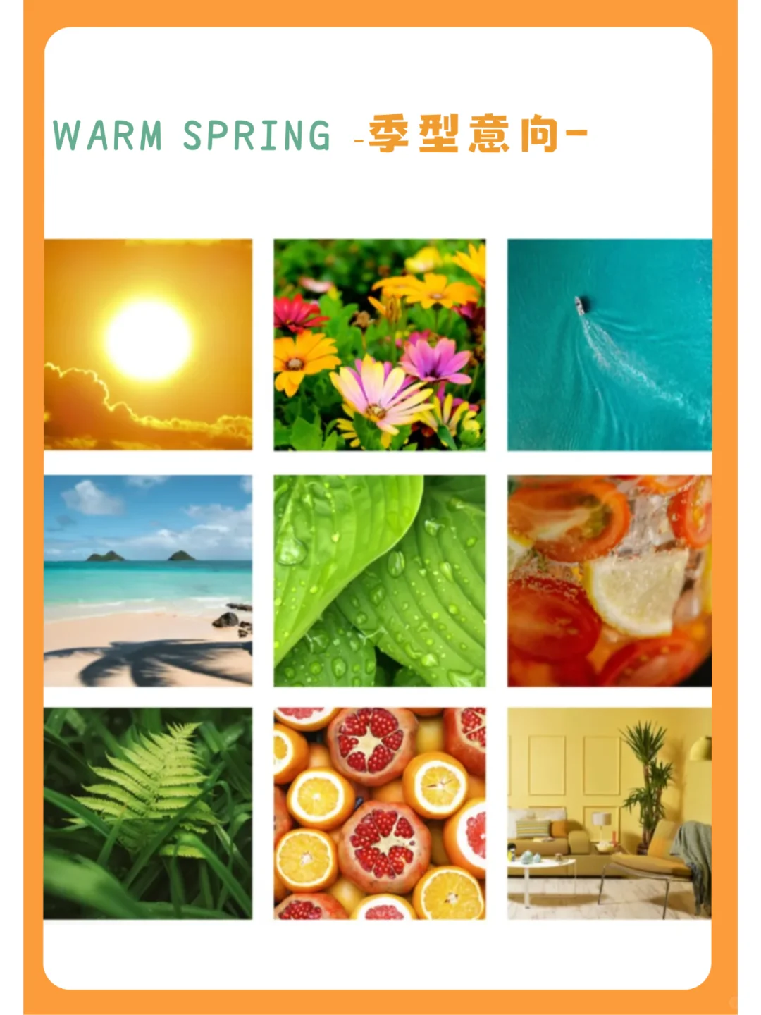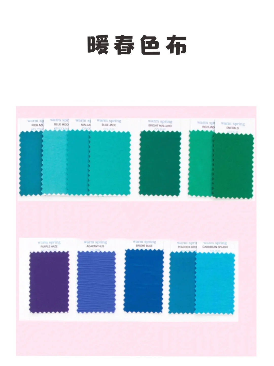 暖春的本命色是明亮鲜嫩、黄色基调的颜色不能大面积用冷色,蓝色要选湖蓝、孔雀蓝之类的暖蓝色 ,不适合灰暗、深沉、浑浊、脏脏的颜色