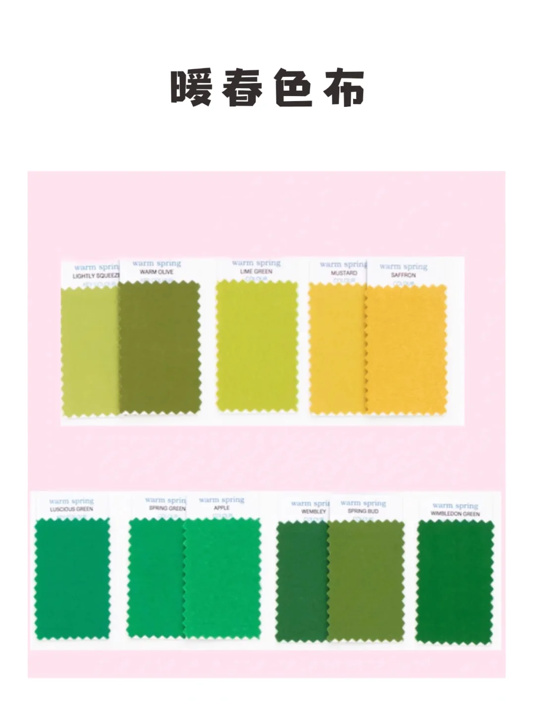 暖春型人适合的颜色:明快、鲜亮、清浅的黄低调色系,像春日里阳光下的花园一样,嫩绿,桃红,鹅黄,一切都是鲜嫩的。