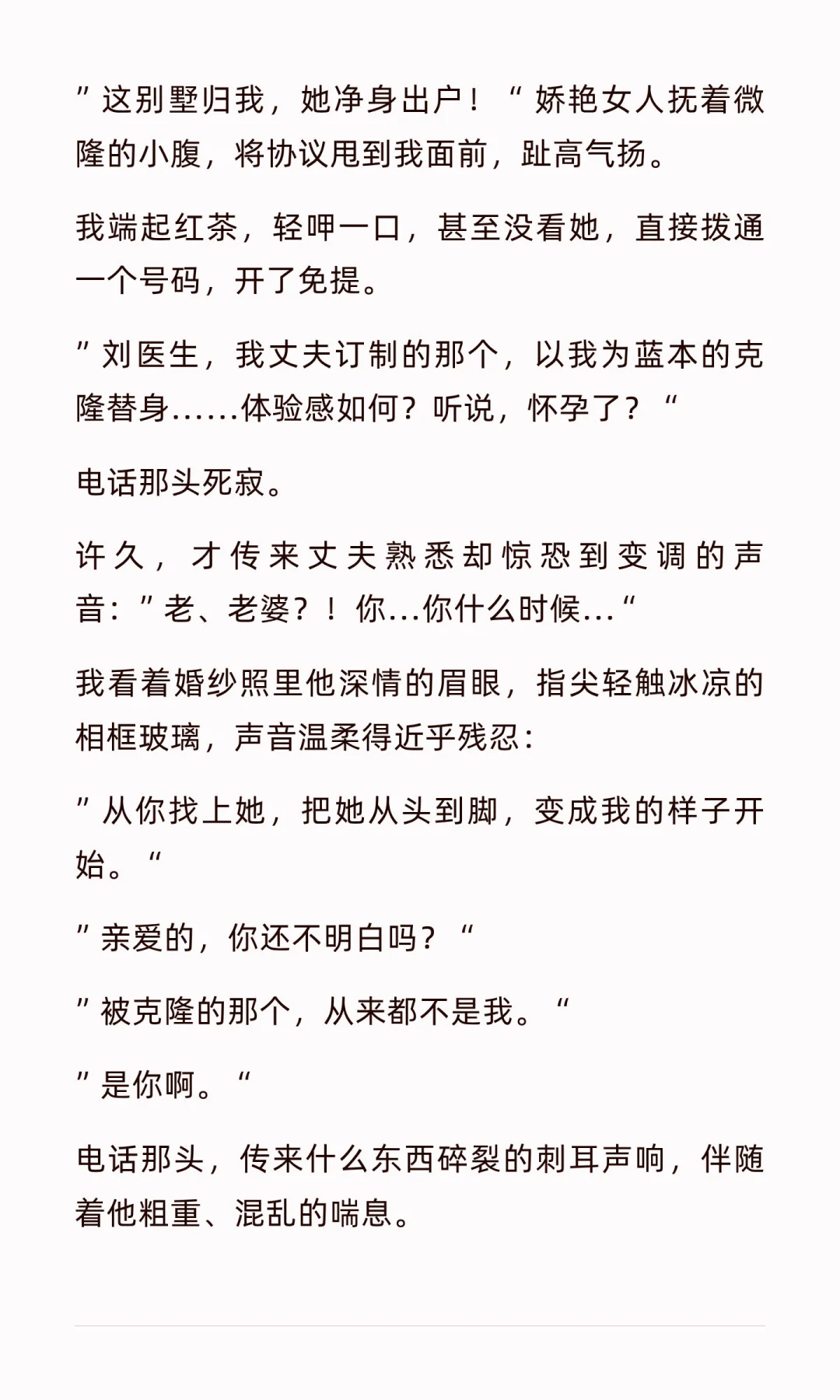 娇艳女人要求净身出户,丈夫却意外得知她与克隆替身怀孕。电话那头传来丈夫的惊恐声音,随后传来物品破碎的声响。