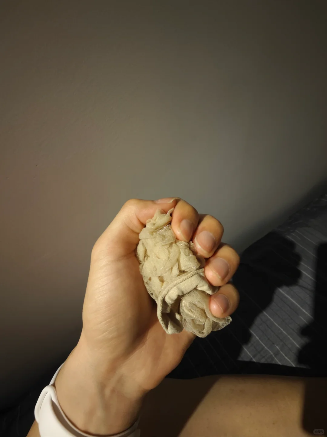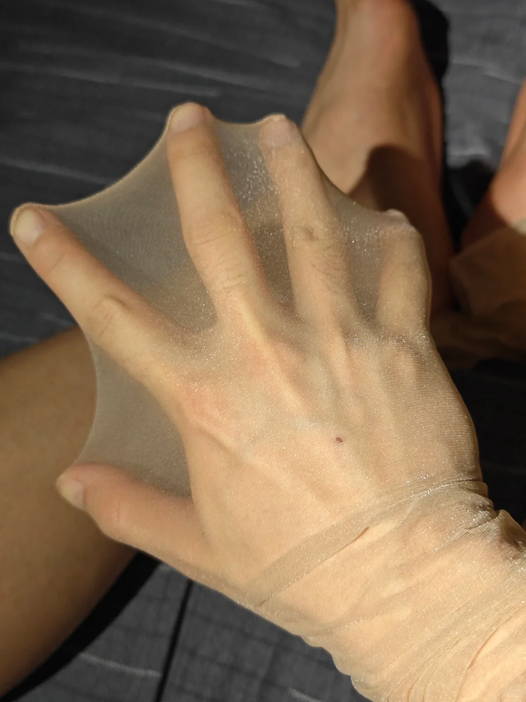 今天穿的这双是非常非常薄的,好像一双袜子只有11.8g,薄到可以一团握在手心里,同样具有包芯丝的光泽,但是缺点也明显,很容易勾丝,我这双穿了几次就不可避免地勾丝了,不过因为薄,勾丝也不容易看出来