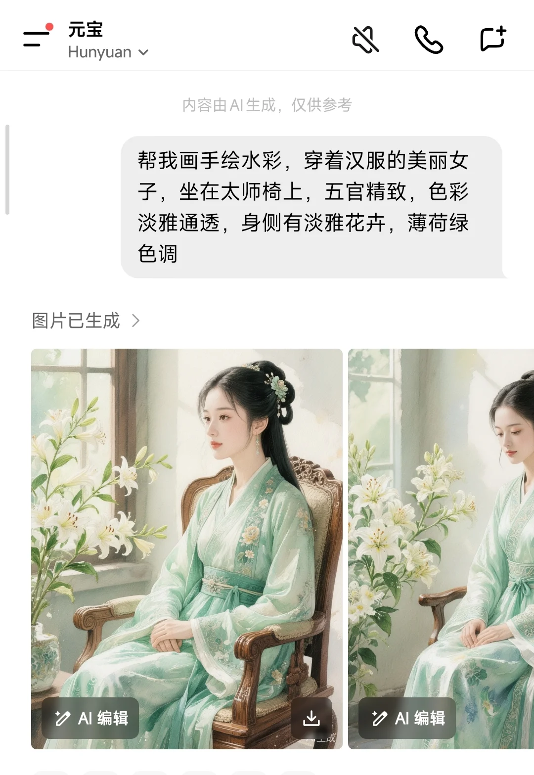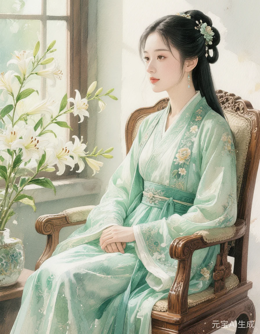 在数字与传统的交界,元宝用AI画笔晕染出江南的温婉。手绘水彩的清透里,汉服女子端坐太师椅,薄荷绿的襦裙似春水漾开,身旁百合轻绽,每一笔都藏着古典与科技的对话。这是AI对东方美学的浪漫解构,让千年风雅在像素间新生,在元宝的“全能处理”中,传统与未来撞了个满怀,绘就独一份的诗意长卷。