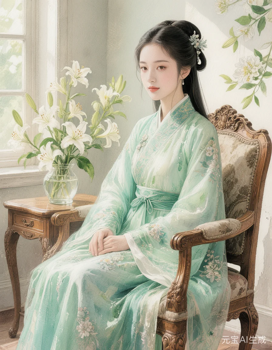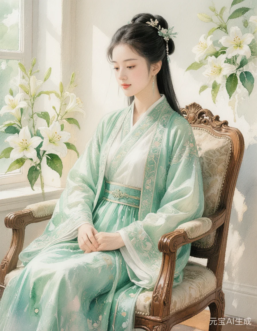 指令如下:帮我画手绘水彩,穿着汉服的美丽女子,坐在太师椅上,五官精致,色彩淡雅通透,身侧有淡雅花卉,薄荷绿色调