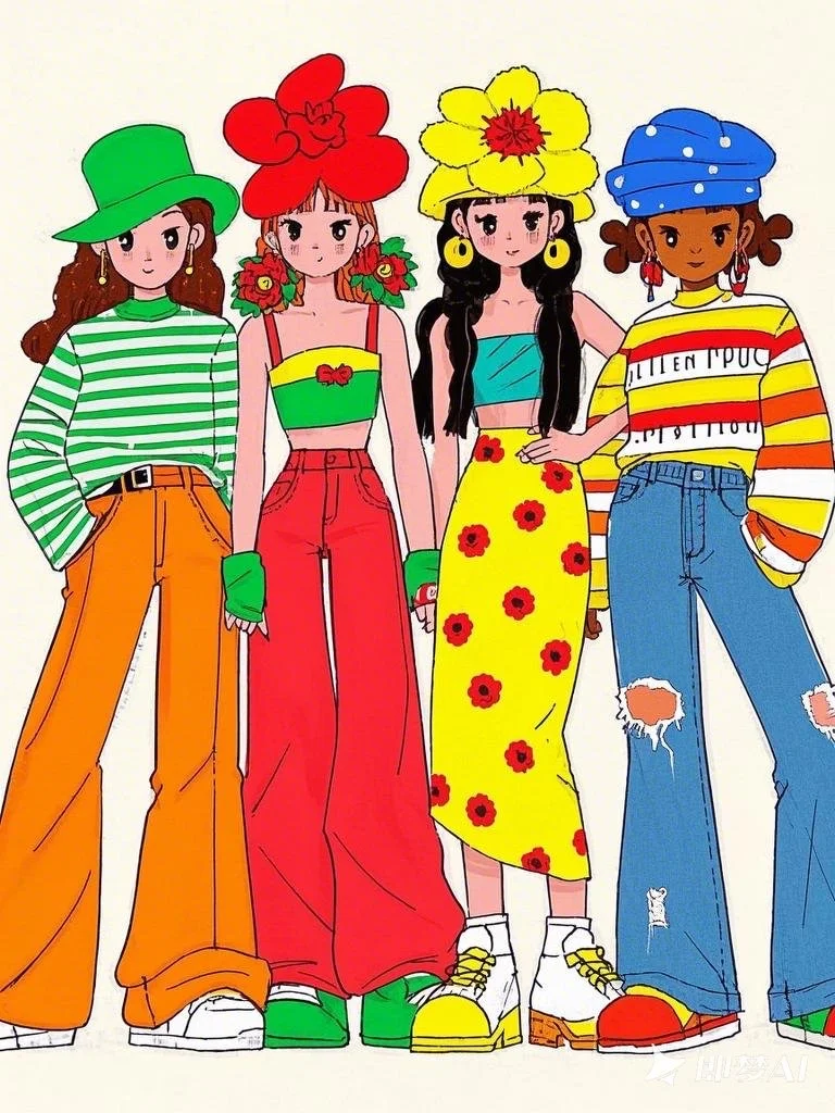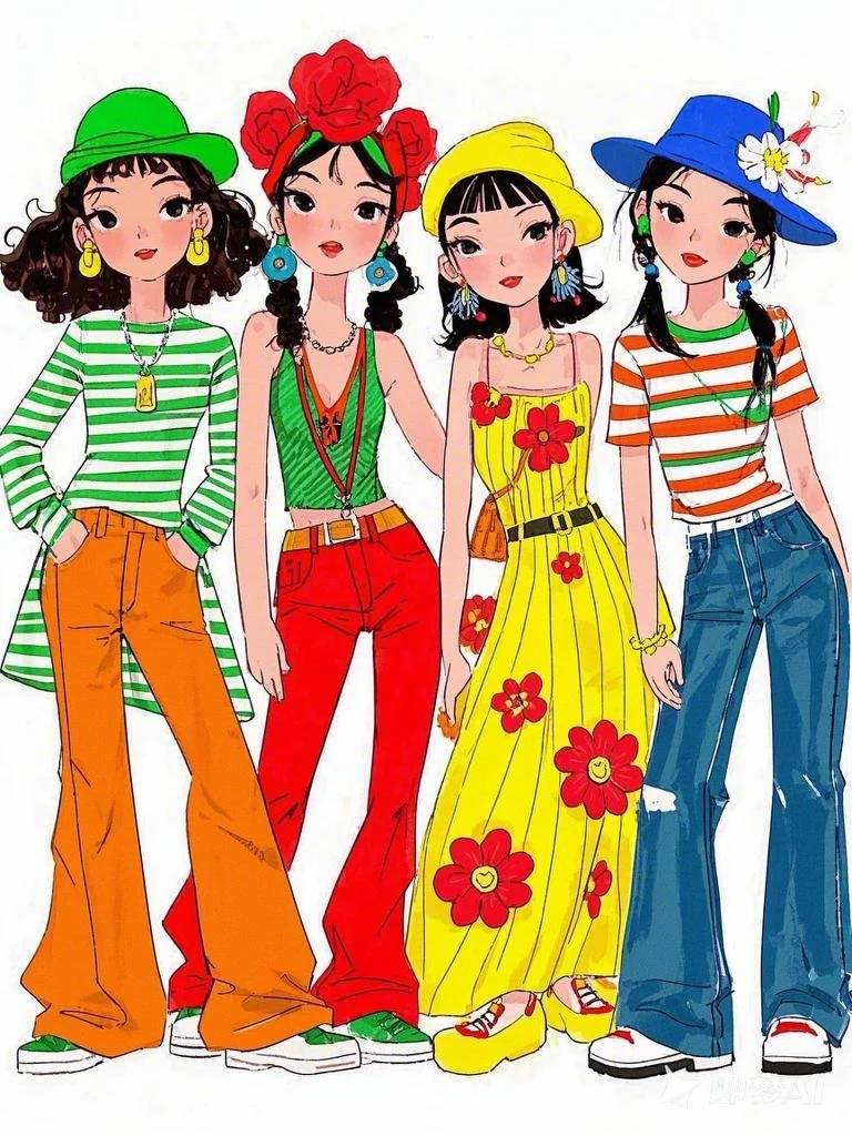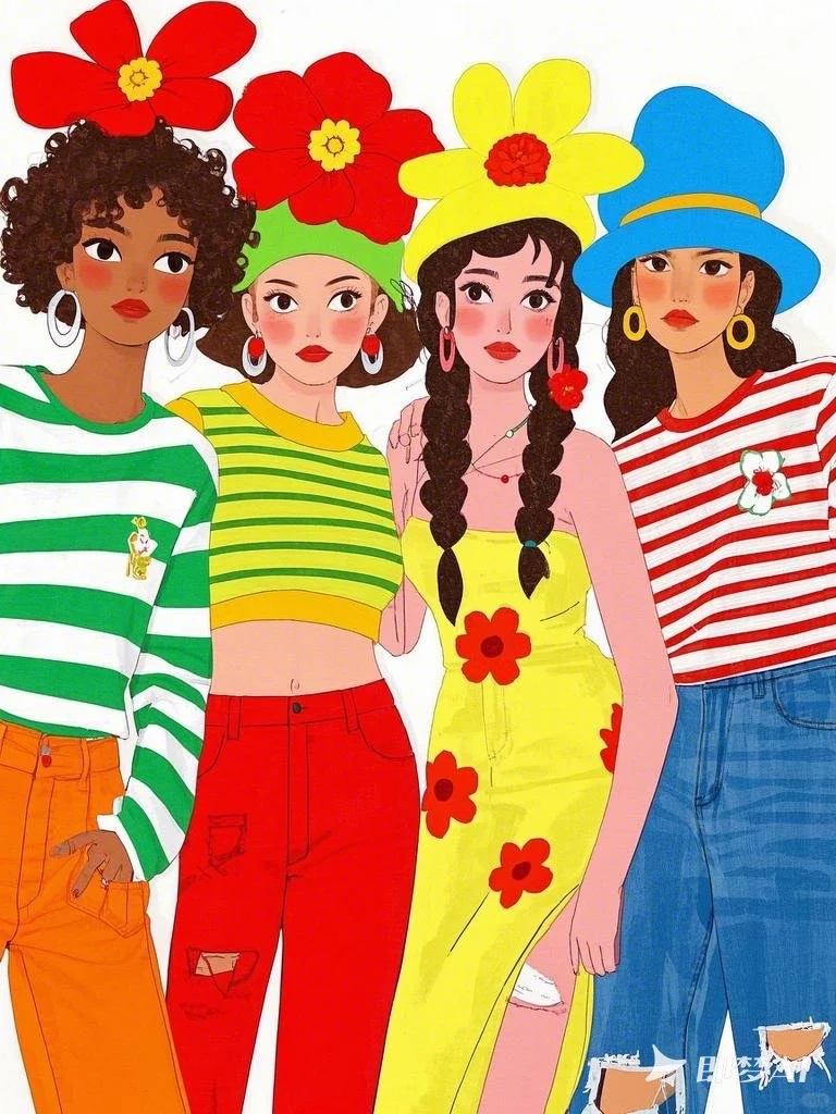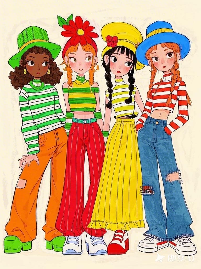 服饰搭配:从左至右,第一个女孩头戴绿色帽子,身穿绿白条纹上衣,搭配橙色卷边裤子;第二个女孩头顶大红色花朵装饰,身着绿黄条纹上衣和红色阔腿裤;第三个女孩戴着黄色帽子,穿着黄色长裙,裙子上有红色花朵图案;第四个女孩戴着蓝色帽子,身着红白条纹上衣,搭配蓝色牛仔裤,裤子上有破洞细节。