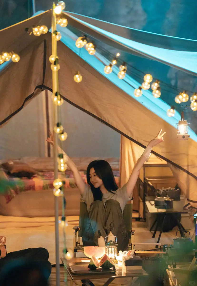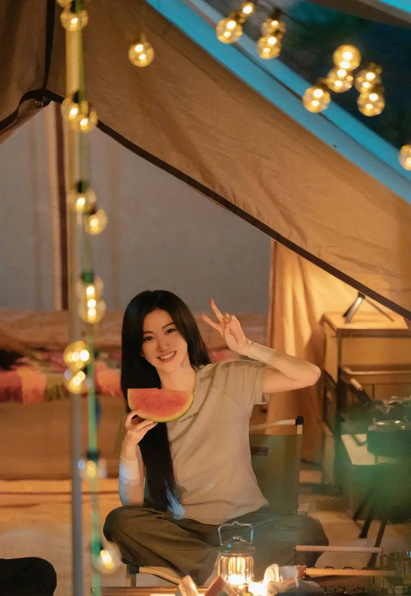 22日,景甜在社交平台上更新一组露营美照,并配文称:“高能量的一天!”照片中,景甜坐在帐篷旁吃西瓜比耶拍照,元气满满,少女感十足。