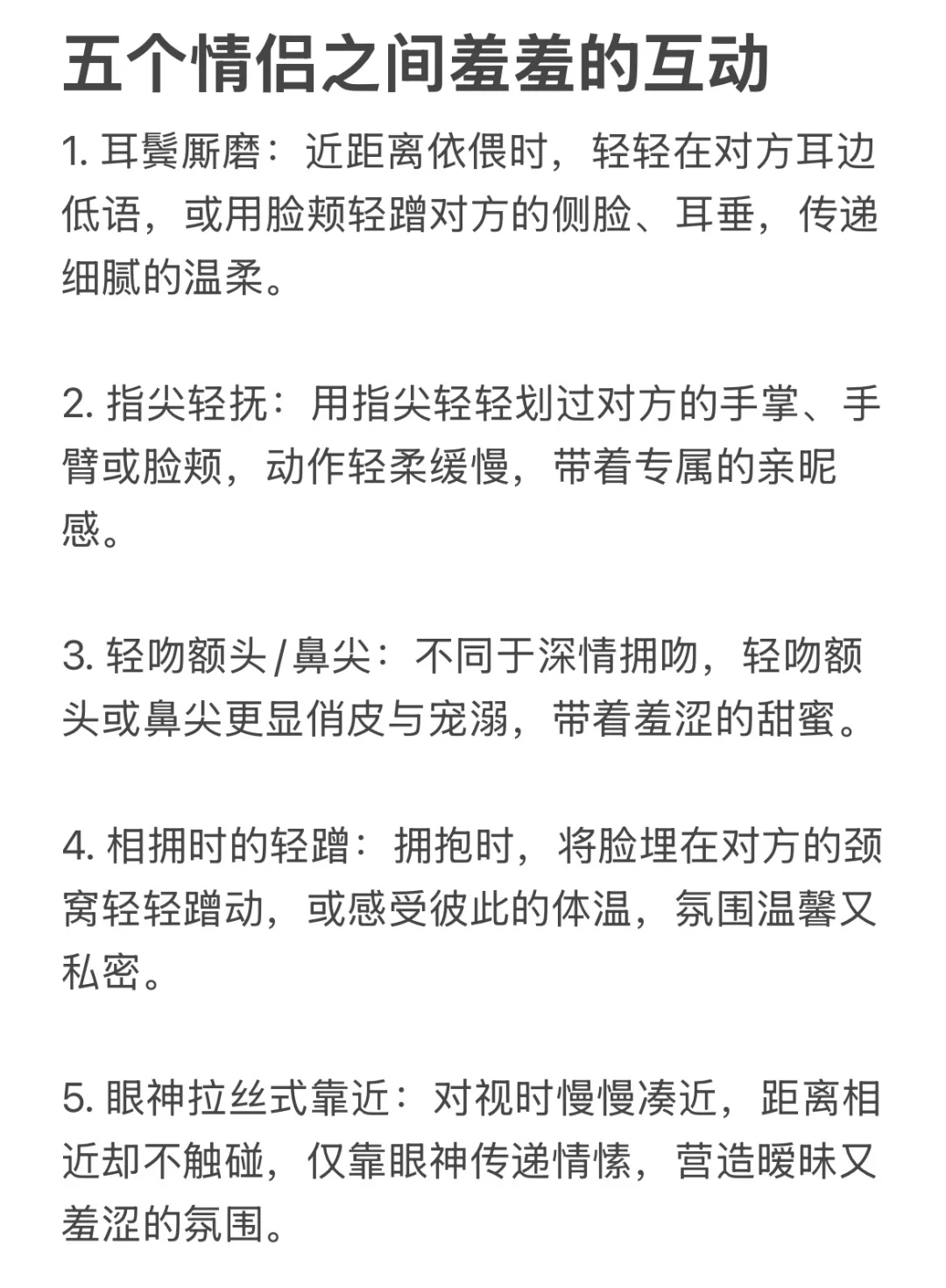 1. 耳鬓厮磨:近距离依偎时,轻轻在对方耳边低语,或用脸颊轻蹭对方的侧脸、耳垂,传递细腻的温柔。