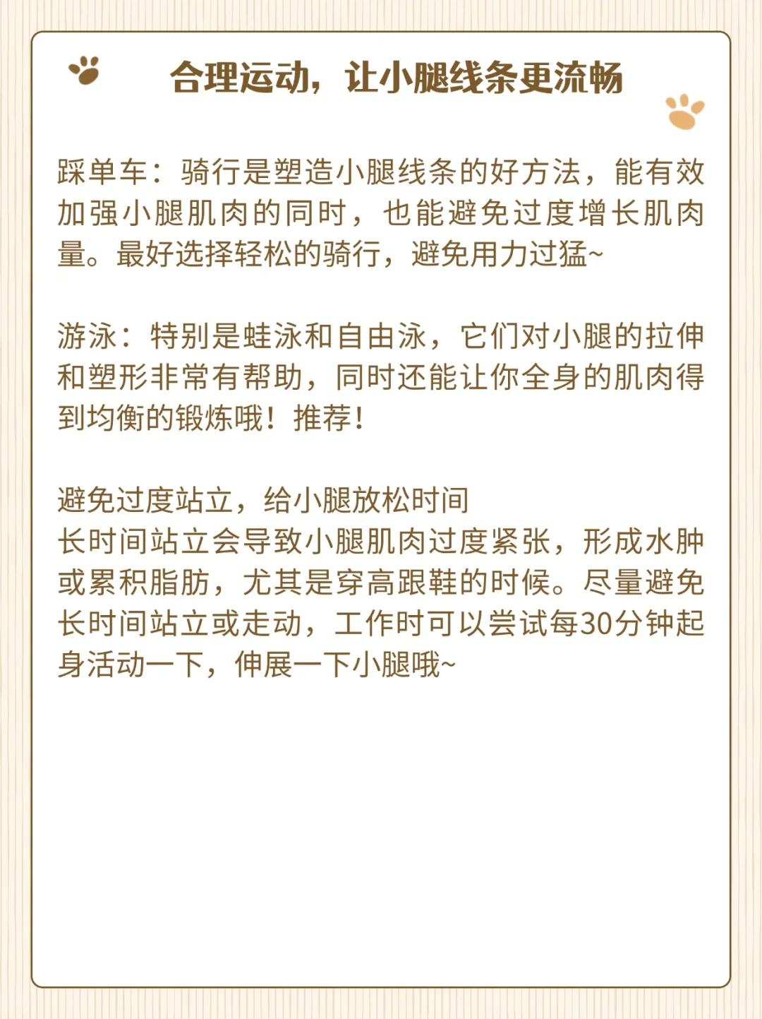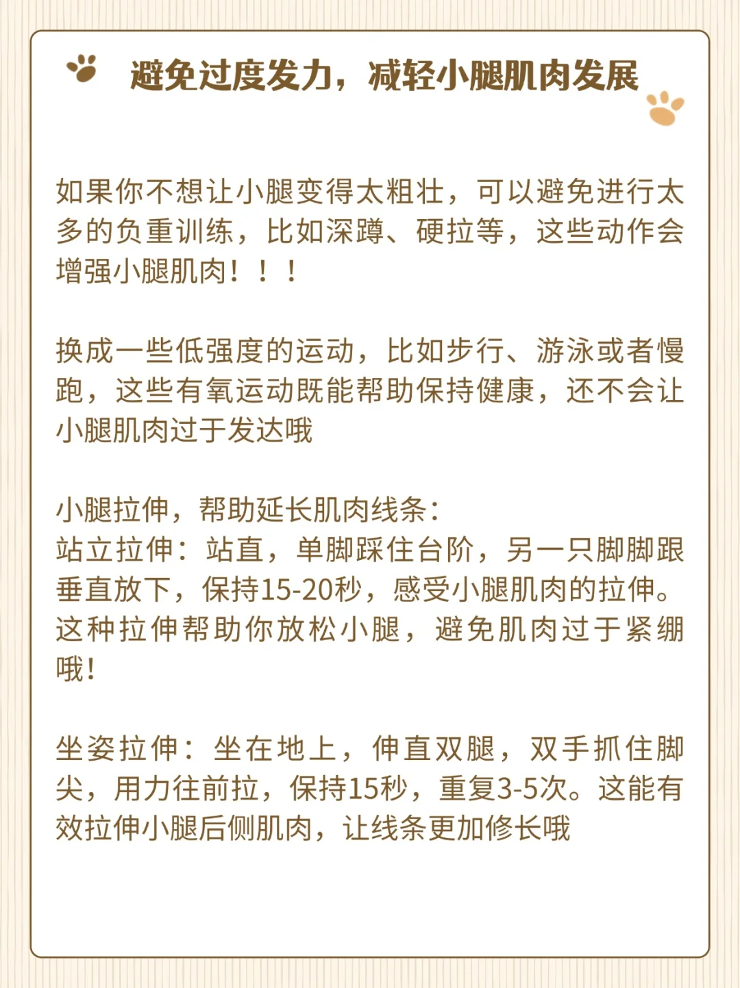 换成一些低强度的运动,比如步行、游泳或者慢跑,这些有氧运动既能帮助保持健康,还不会让小腿肌肉过于发达哦
