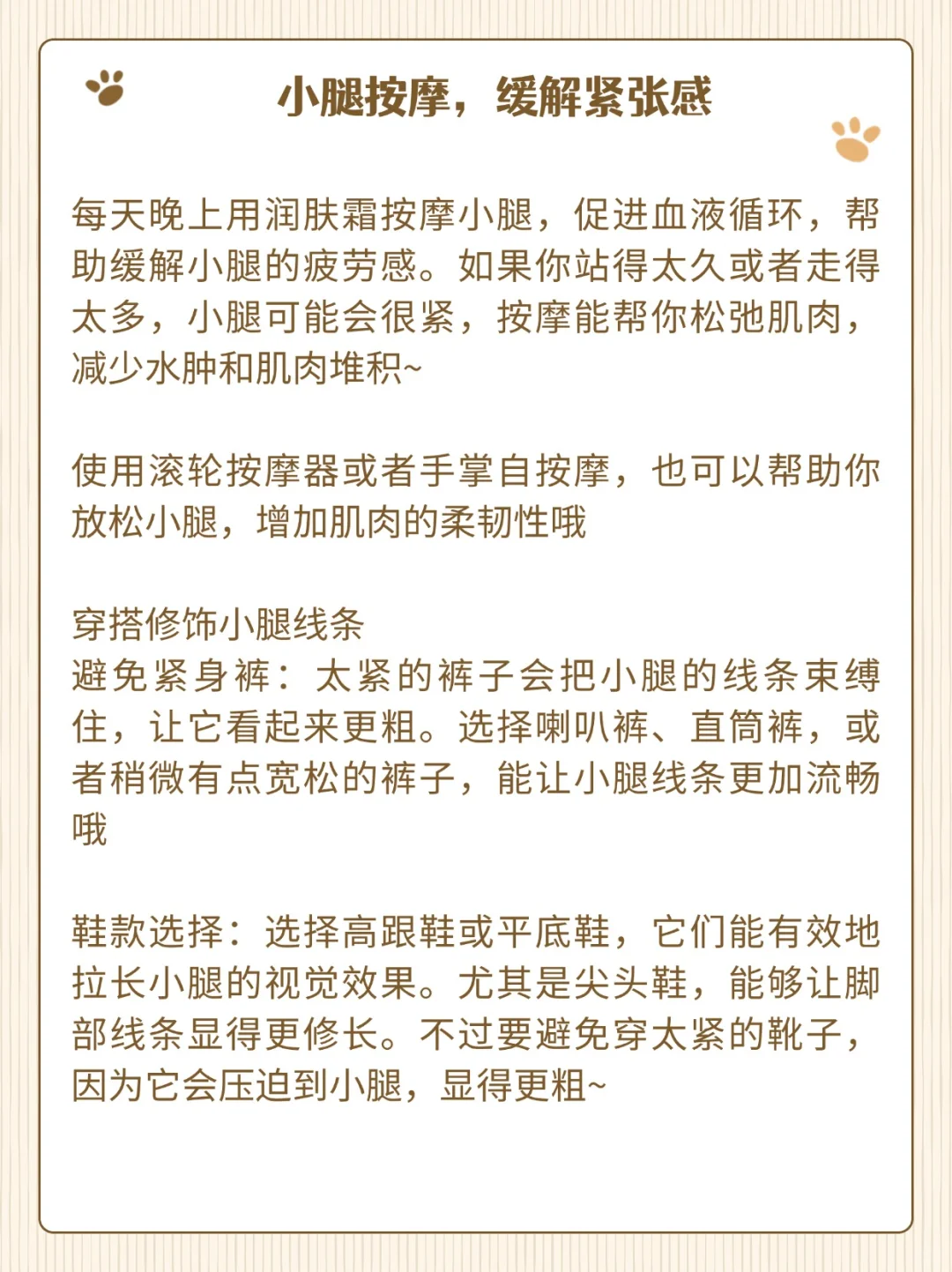 每天晚上用润肤霜按摩小腿,促进血液循环,帮助缓解小腿的疲劳感。如果你站得太久或者走得太多,小腿可能会很紧,按摩能帮你松弛肌肉,减少水肿和肌肉堆积~