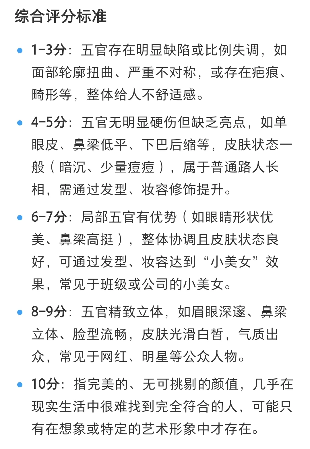 8-9分:五官精致立体,如眉眼深邃、鼻梁立体、脸型流畅,皮肤光滑白皙,气质出众,常见于网红、明星等公众人物。