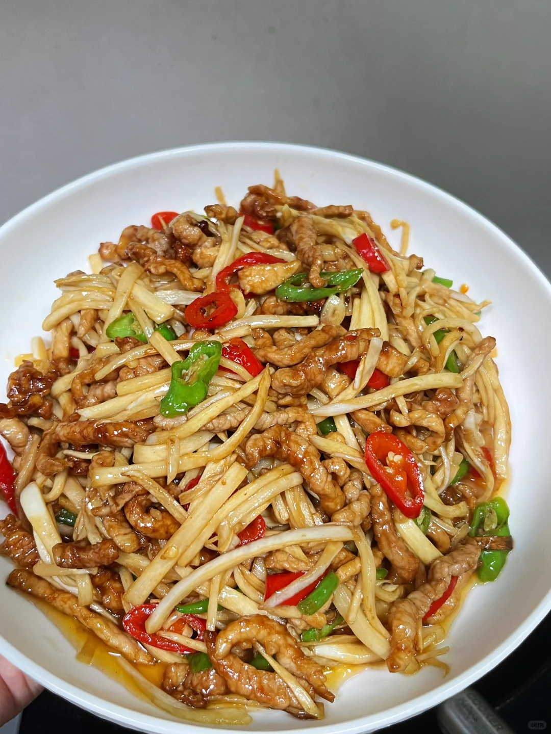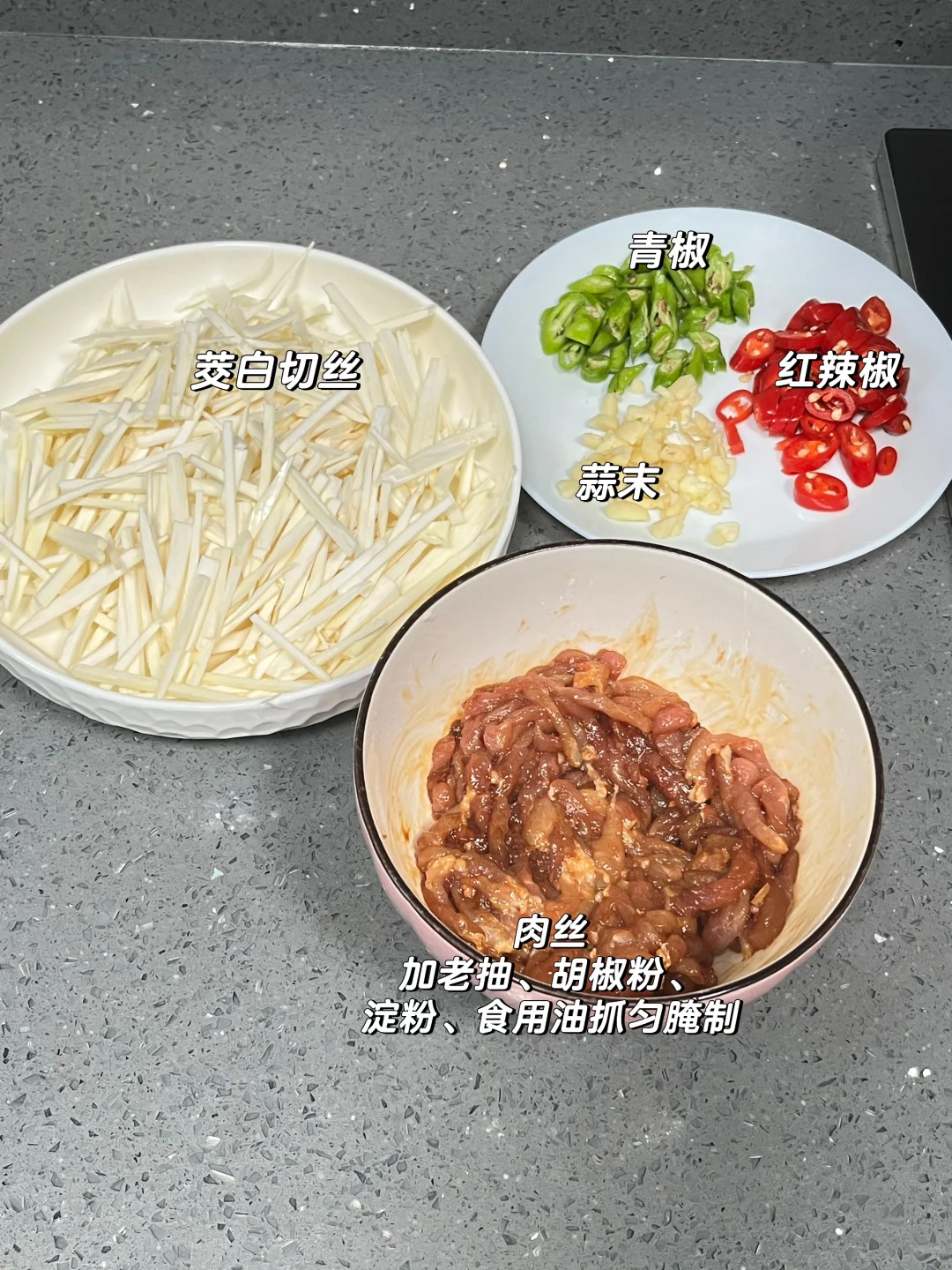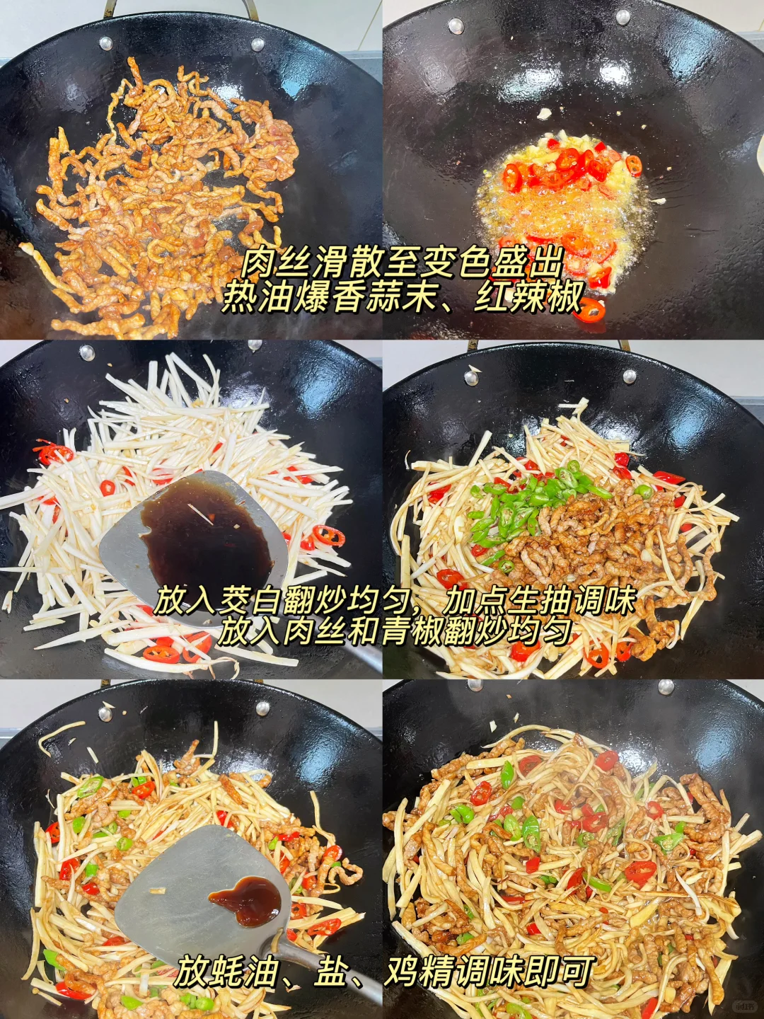 1⃣️肉丝加老抽、淀粉、胡椒粉、食用油抓匀腌制一会儿。油热放肉丝滑散至变色盛出