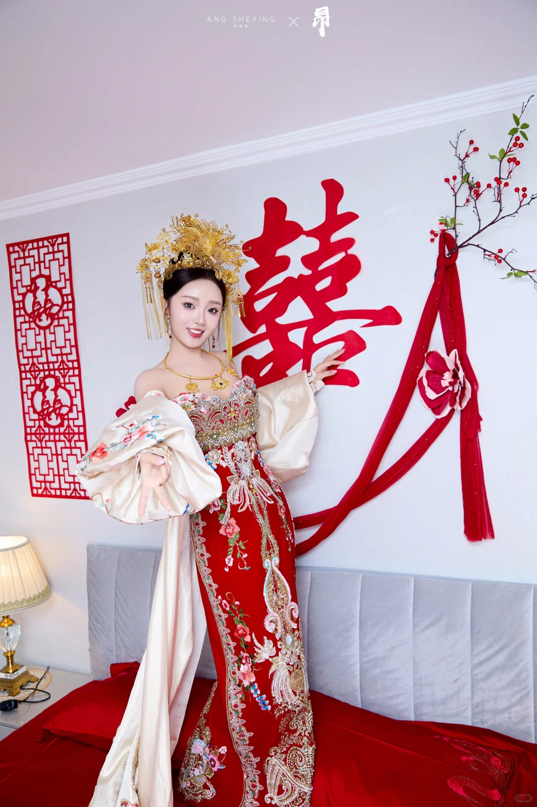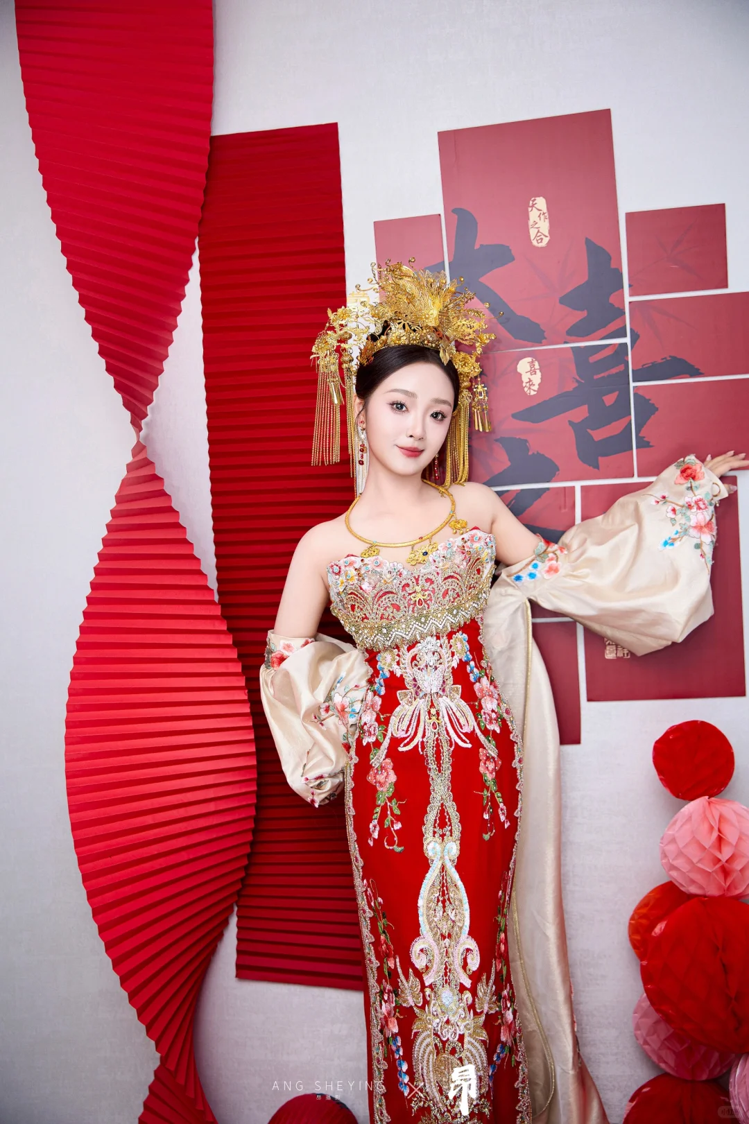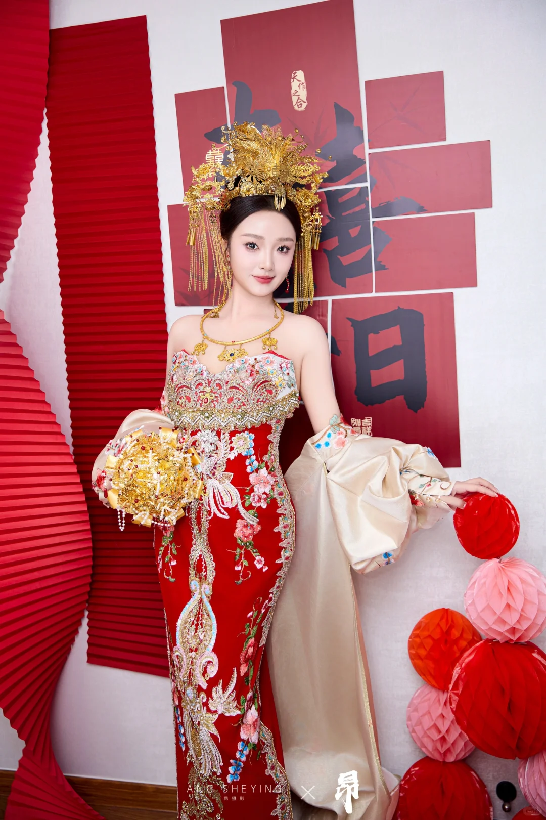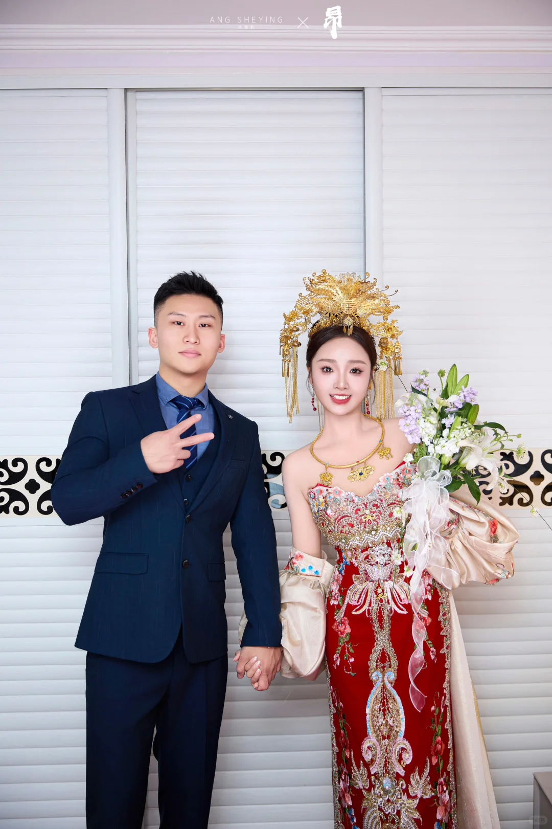 1️⃣针对衣服的选择,我的要求就是偏小众且每套的风格变化大些,所以到婚纱店选、试纱不下五次,店里的化妆师到换装的小姐姐都非常耐心,服务杠杠滴婚礼结束后出乎意料的听到很多老公兄弟的点评,让我觉得可能男生的视角更不一样。他们说陪朋友接过很多次亲,但这次开门的瞬间让人眼前一亮,不再是千篇一律的红、白秀合,更为独特、高级,这套秀合也是我最为满意一套我的身材属于背、肩薄但胳膊粗,试了无数套婚纱,这套婚纱最深得我心,显得我小小一只😬有种人在衣中晃的感觉(敬酒服的造型也超爱,但是因为太匆忙没来得及拍照很是遗憾)。我的美丽创造官慧慧,全程光睫毛就被我哭掉三四次,换妆还直接昏睡慧慧人超美而且温柔,风格高级真的无可挑剔,闭眼选!