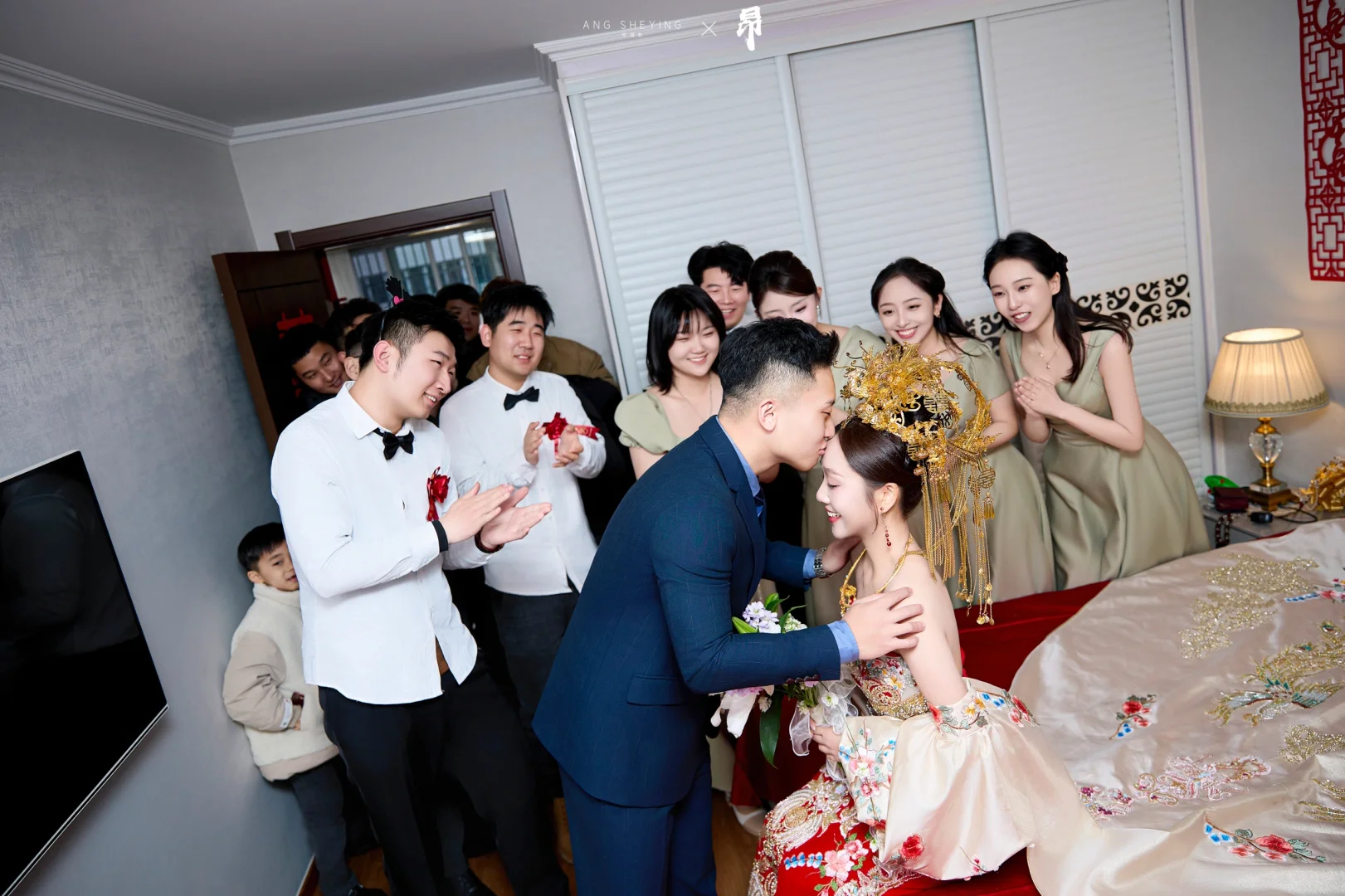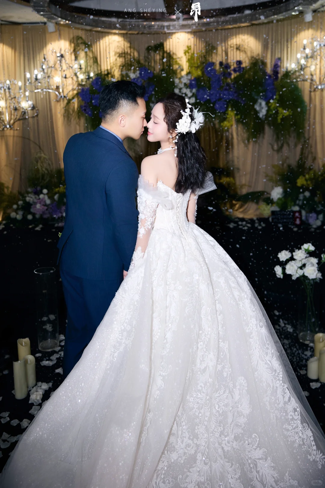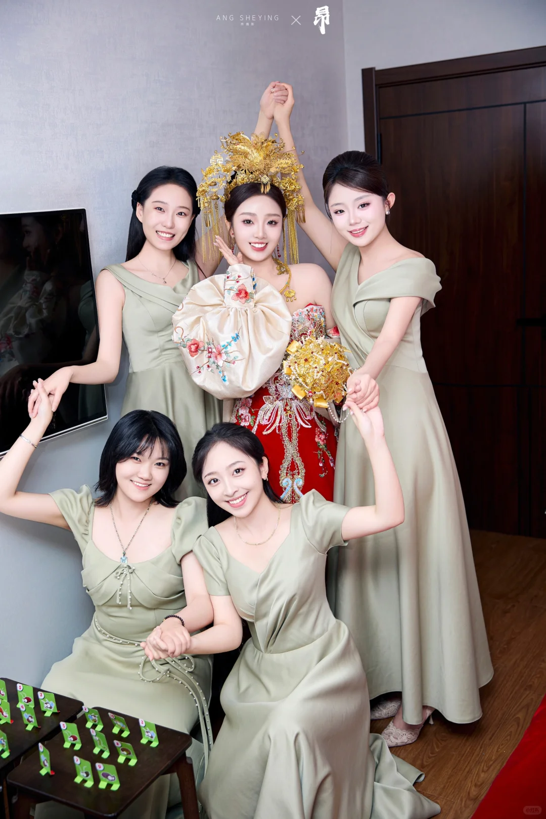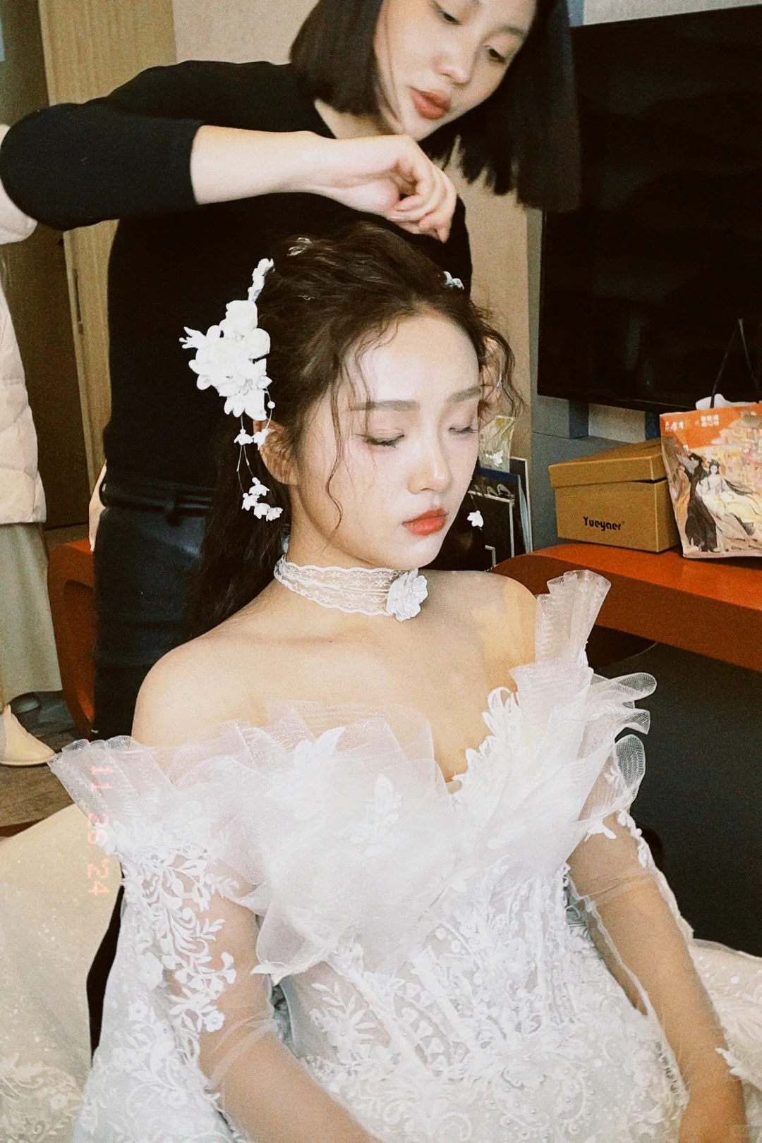 1️⃣针对衣服的选择,我的要求就是偏小众且每套的风格变化大些,所以到婚纱店选、试纱不下五次,店里的化妆师到换装的小姐姐都非常耐心,服务杠杠滴婚礼结束后出乎意料的听到很多老公兄弟的点评,让我觉得可能男生的视角更不一样。他们说陪朋友接过很多次亲,但这次开门的瞬间让人眼前一亮,不再是千篇一律的红、白秀合,更为独特、高级,这套秀合也是我最为满意一套我的身材属于背、肩薄但胳膊粗,试了无数套婚纱,这套婚纱最深得我心,显得我小小一只😬有种人在衣中晃的感觉(敬酒服的造型也超爱,但是因为太匆忙没来得及拍照很是遗憾)。我的美丽创造官慧慧,全程光睫毛就被我哭掉三四次,换妆还直接昏睡慧慧人超美而且温柔,风格高级真的无可挑剔,闭眼选!