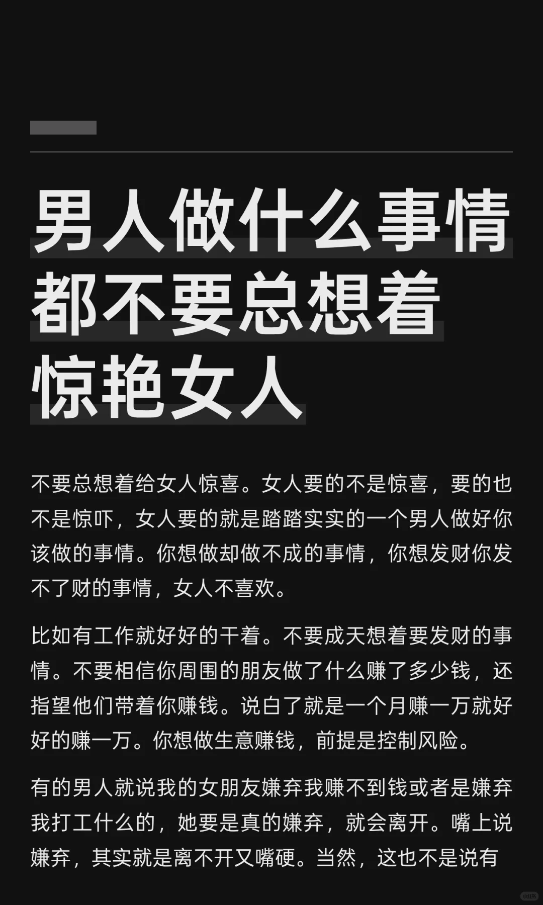 与女人相处时,不要总想着给她惊喜或惊吓,而是踏踏实实做好本职工作。避免盲目听信他人赚钱项目,控制风险,选择可靠机会。男人应专注于自身发展,避免被外界诱惑影响判断,保持清醒。
