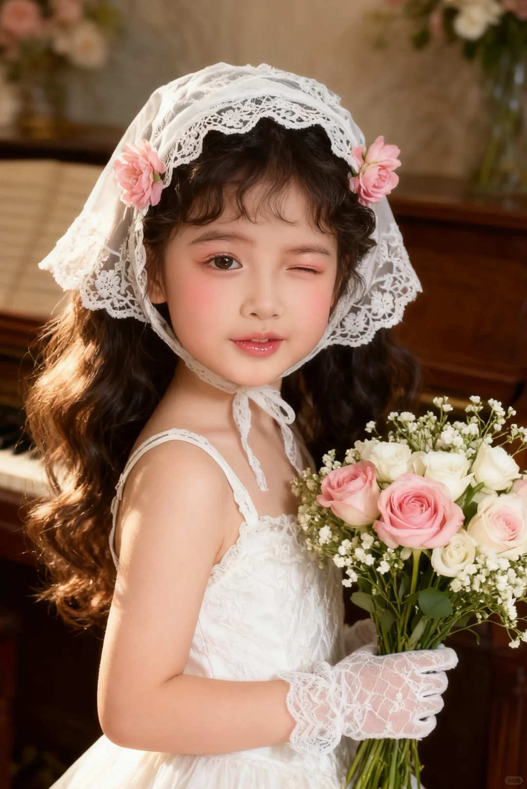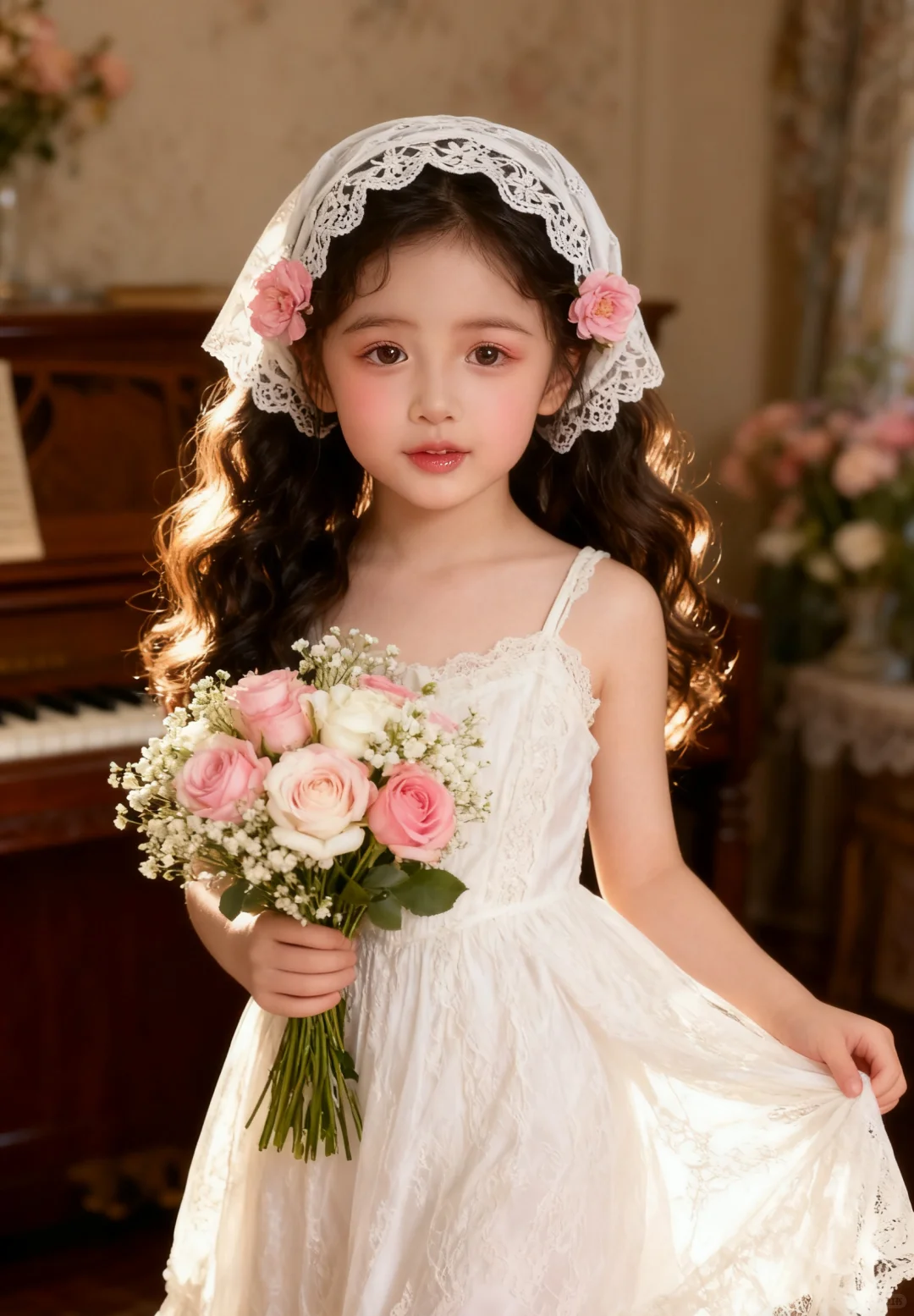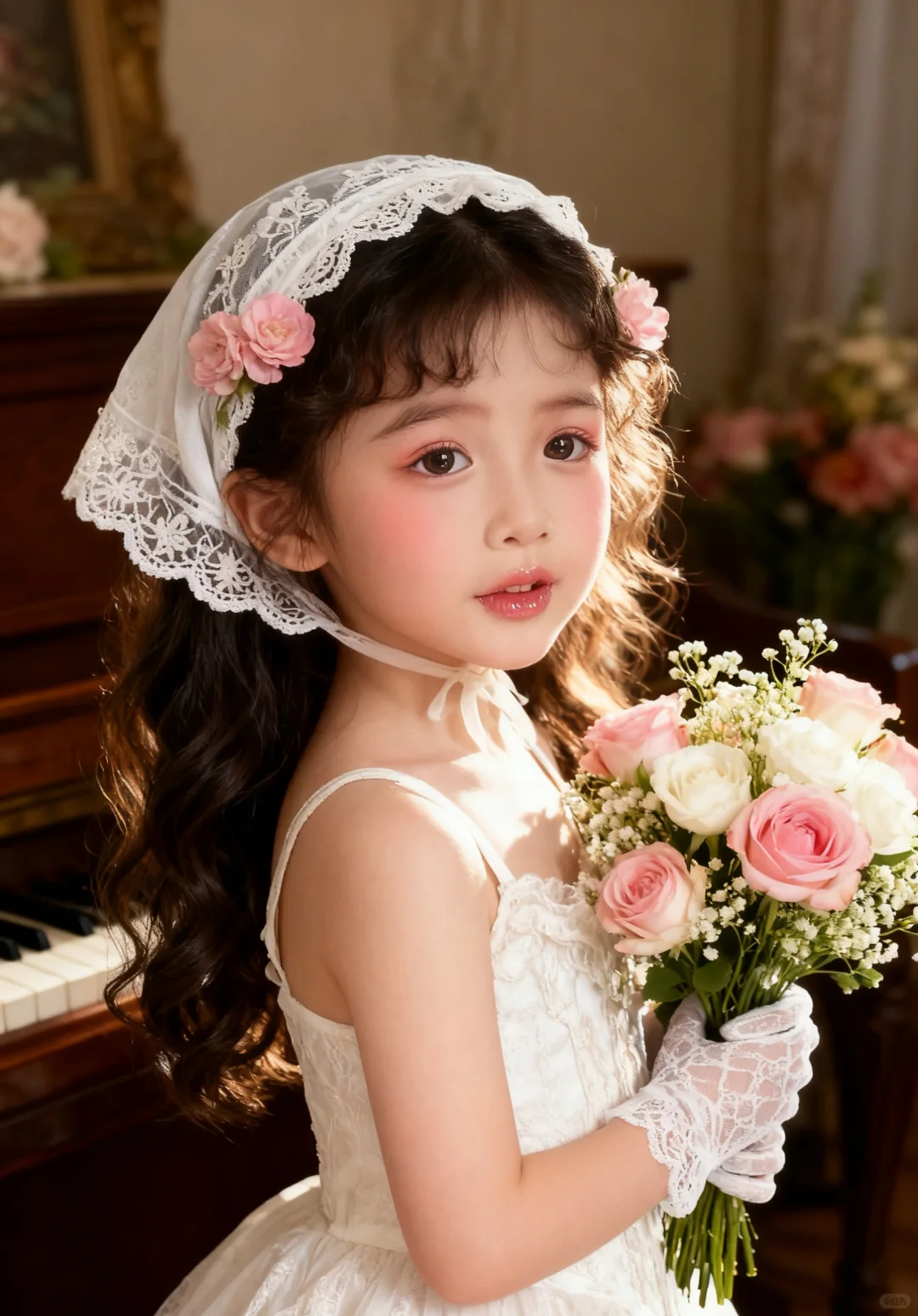 确保原图女孩的五官相貌不变,去除原图所有配件道具服饰及背景,生成10张新的不同表情动作姿势的图片,女孩甜系洛丽塔风格妆容,眼影选择淡粉色系,腮红为大面积的桃粉色,自然晕染在苹果肌,唇妆是通透的水粉色,带有玻璃唇光泽,长发做微卷处理,搭配白色蕾丝头巾,头巾边缘的蕾丝花纹精致细腻,还点缀了两朵粉色花朵发饰,与手中花束色彩呼应,搭配白色蕾丝短手套,身着白色蕾丝吊带裙,面料的蕾丝纹理细腻,剪裁贴合身形,手持由粉色、白色玫瑰及满天星组成的花束,花束色彩柔和,采用半身人像构图,将焦点集中在人物的上半身,突出妆造、服饰与花束的细节,人物呈侧身姿态,运用柔和的侧逆光,光线从侧面洒在人物身上,让发丝、蕾丝面料呈现出细腻的质感,没有明显的强光和阴影,很好地突出了妆容的细腻和服饰的轻柔。