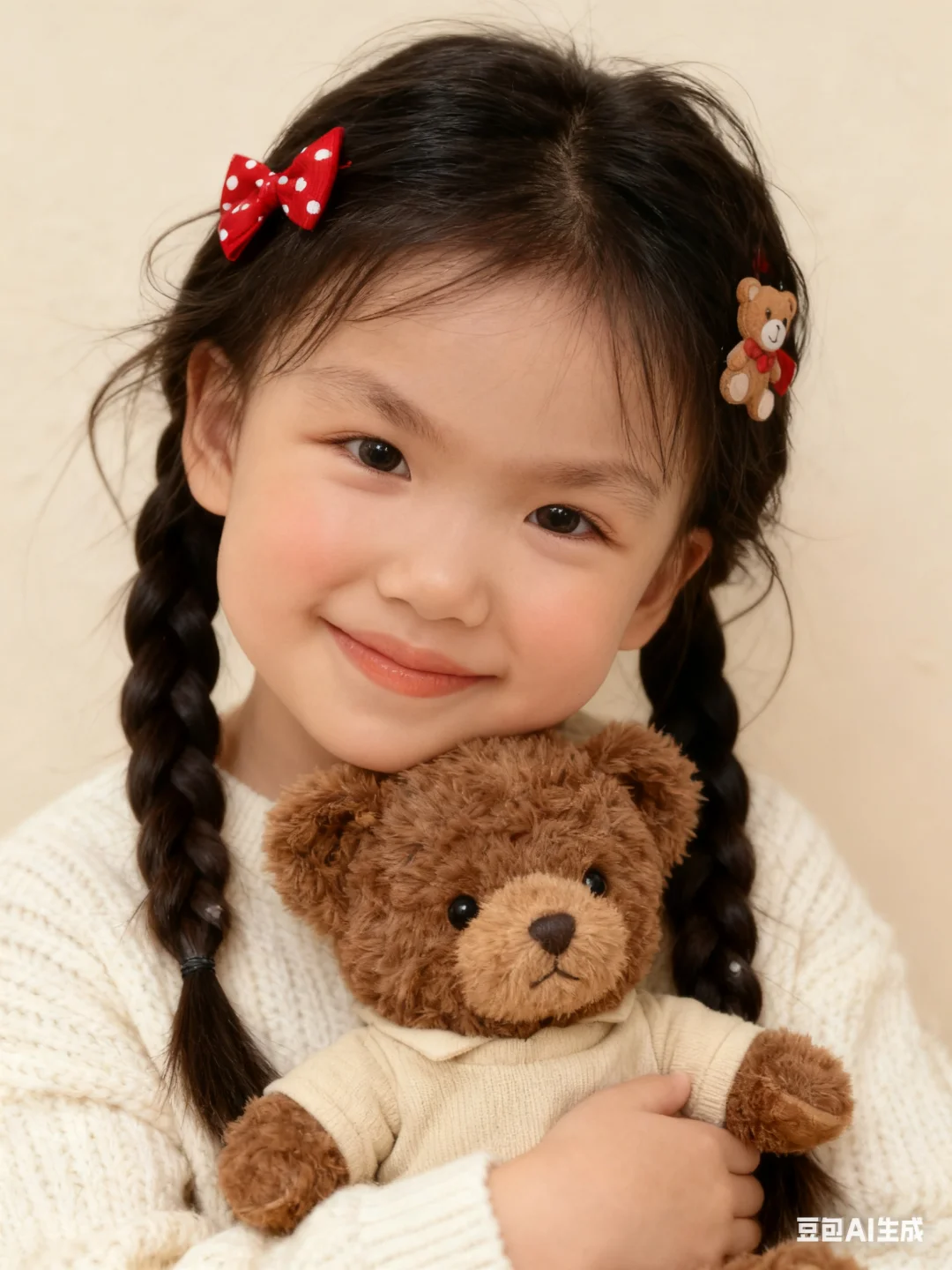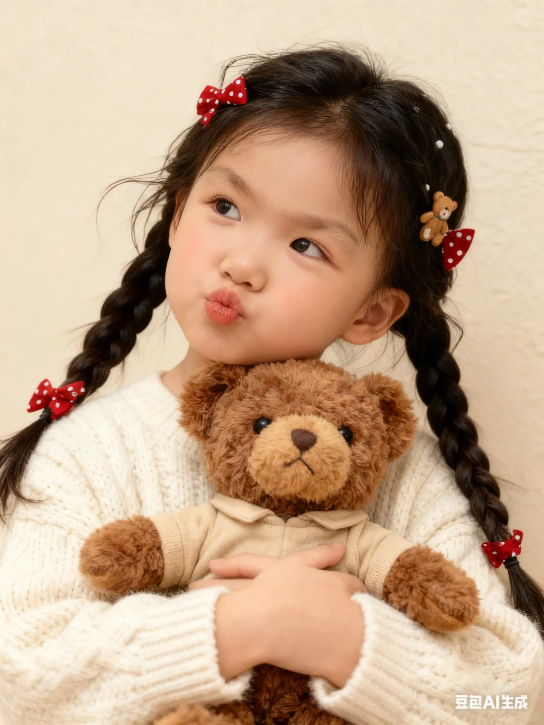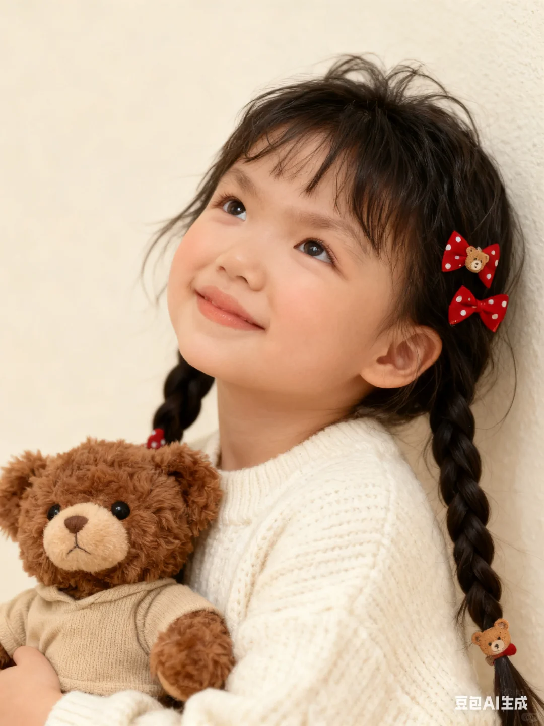 宝宝造型:梳两条麻花辫,少量碎发自然散落,辫子上装饰带白色小波点的红色蝴蝶结发饰及小熊发卡;身着米白色羊绒针织毛衣,质感柔软细腻;双手抱着一只棕色毛绒小熊玩偶,玩偶穿米色衣服,憨态可掬,与宝宝可爱气质相契合。