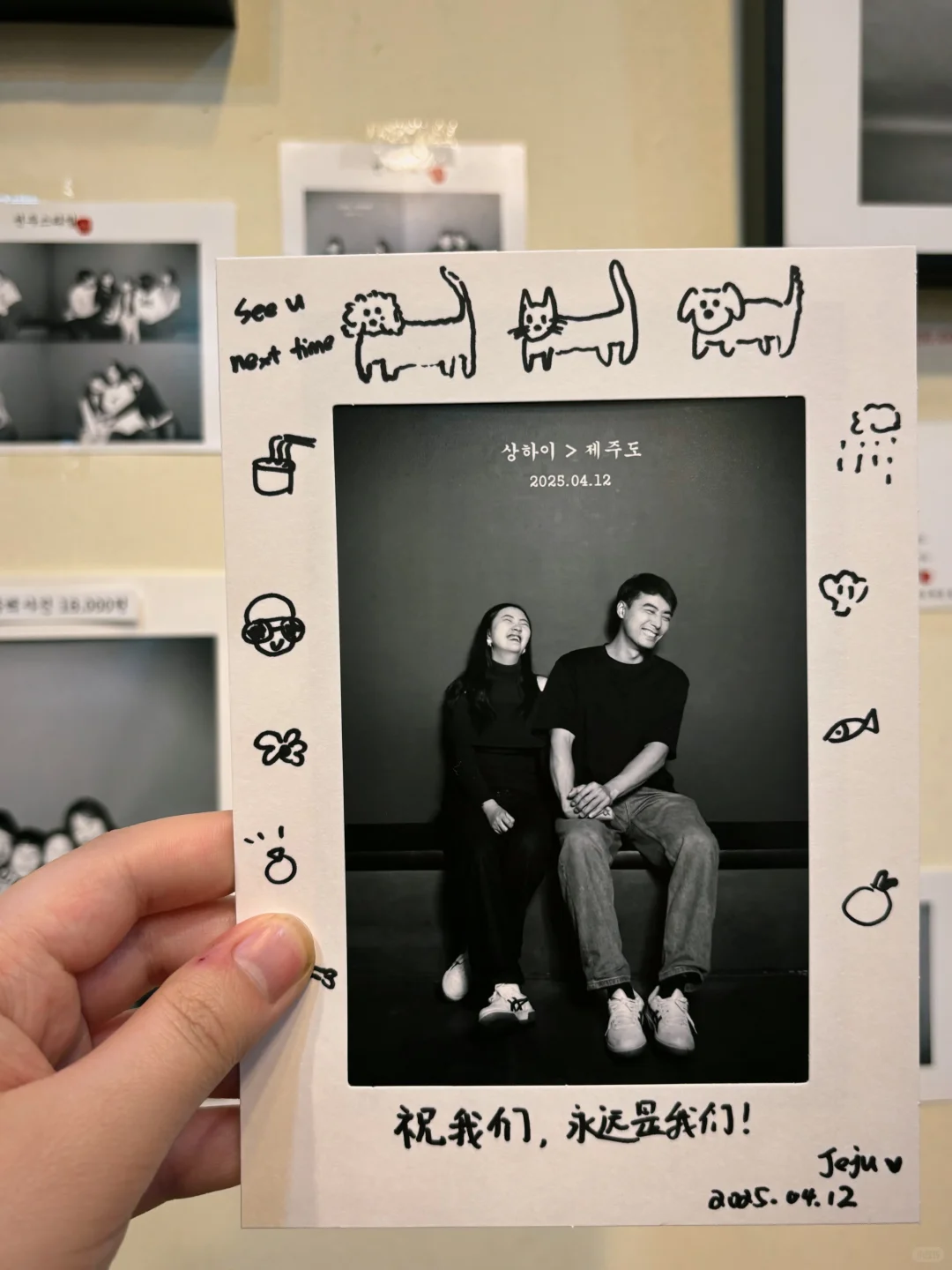 在济州岛市区酒店附近偶然发现这家相馆 是一位大叔开的 门头是很多很多开怀大笑的照片 有情侣、朋友、家人… 走进去以后发现是相馆