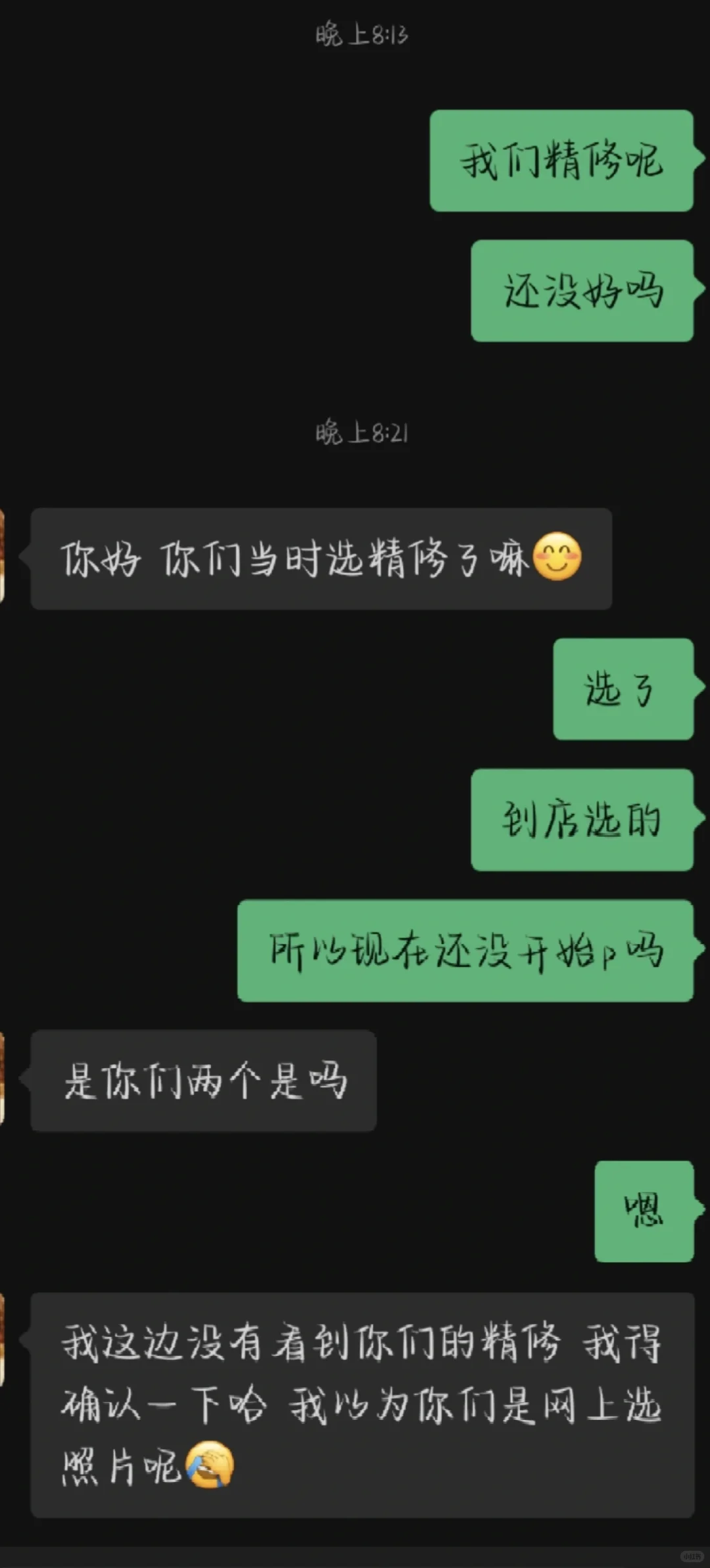 本来这些也都没什么忍忍就过去了,说精修时间长我也不催一直等着,结果看到比我晚拍的人精修都拿到了我才去问,结果跟我说忘了没p!!(9.9选的精修到现在也没p)