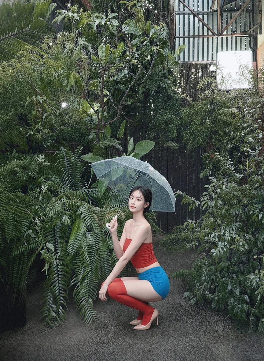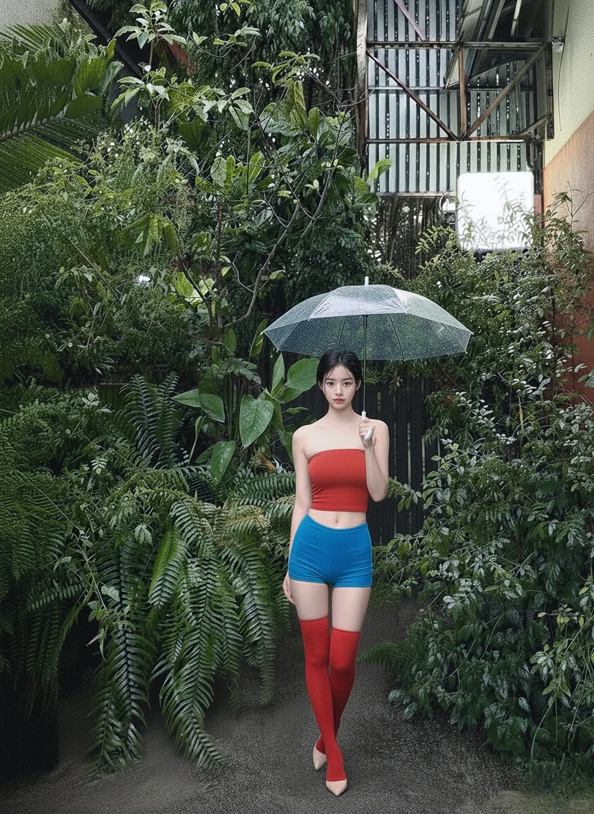 雨天、红内搭,蓝短裤,红丝袜