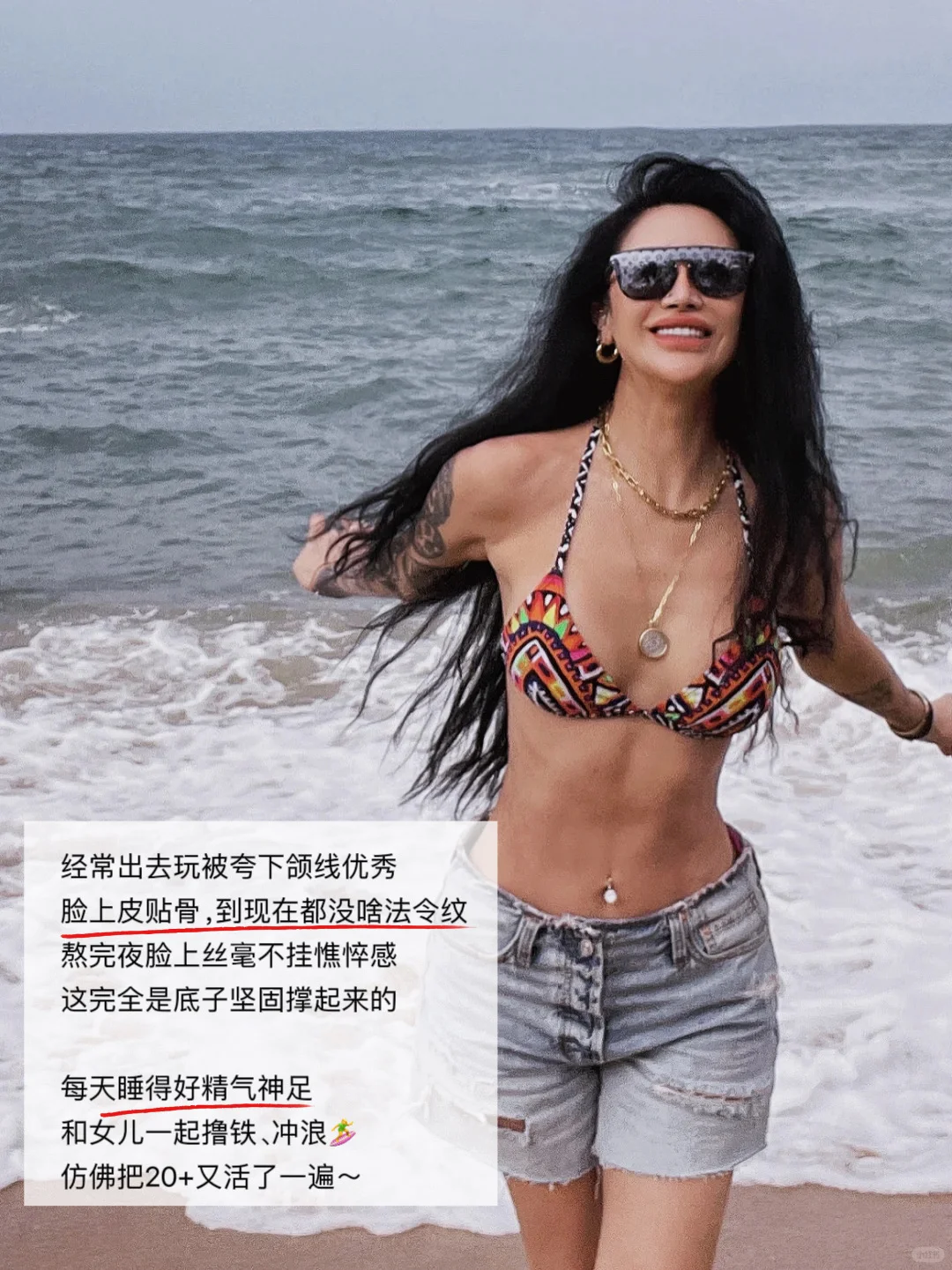 经常出去玩被夸下颌线优秀,脸上皮贴骨,到现在都没啥法令纹,有时候熬完夜第二天脸上也丝毫不挂憔悴感,这完全是底子坚固撑起来的。每天睡得好精气神足,和女儿一起撸铁、冲浪,仿佛把20+又活了一遍