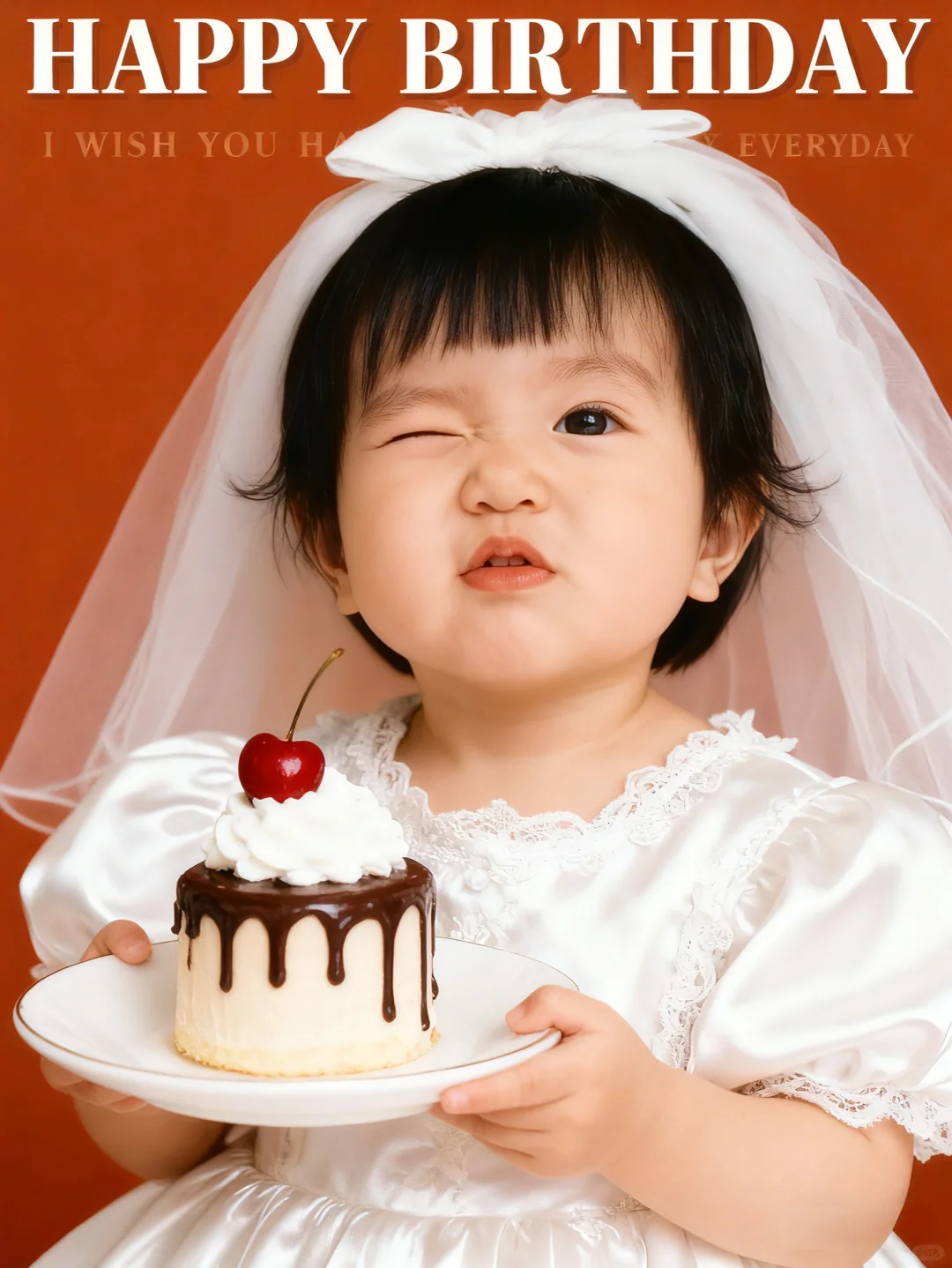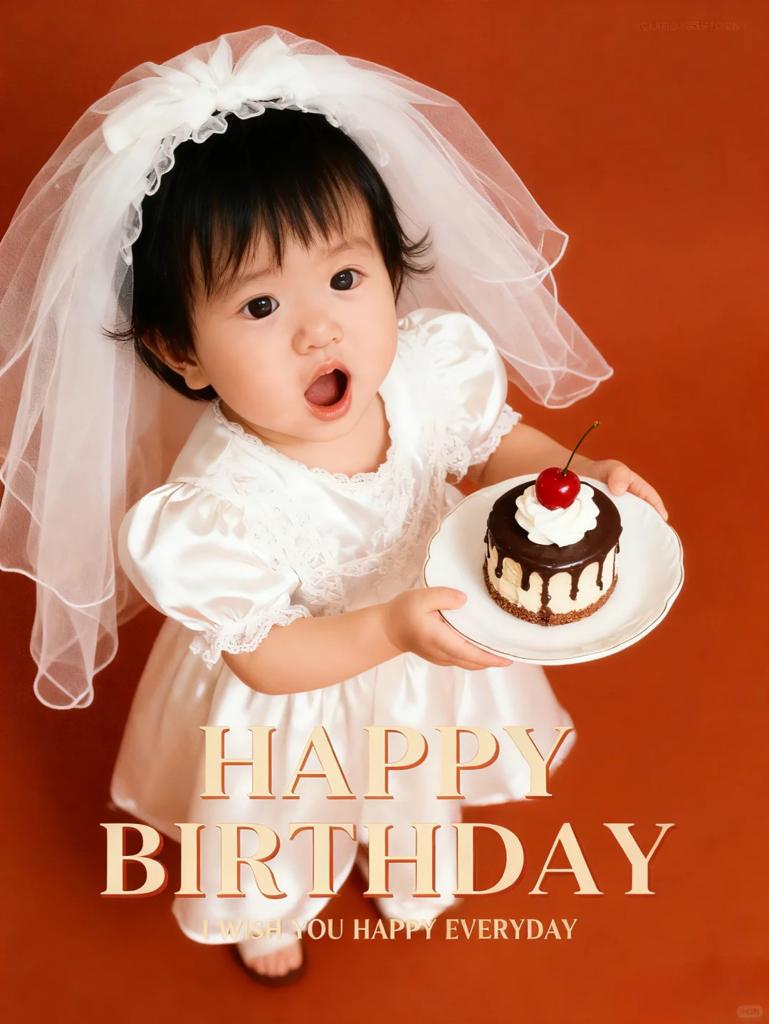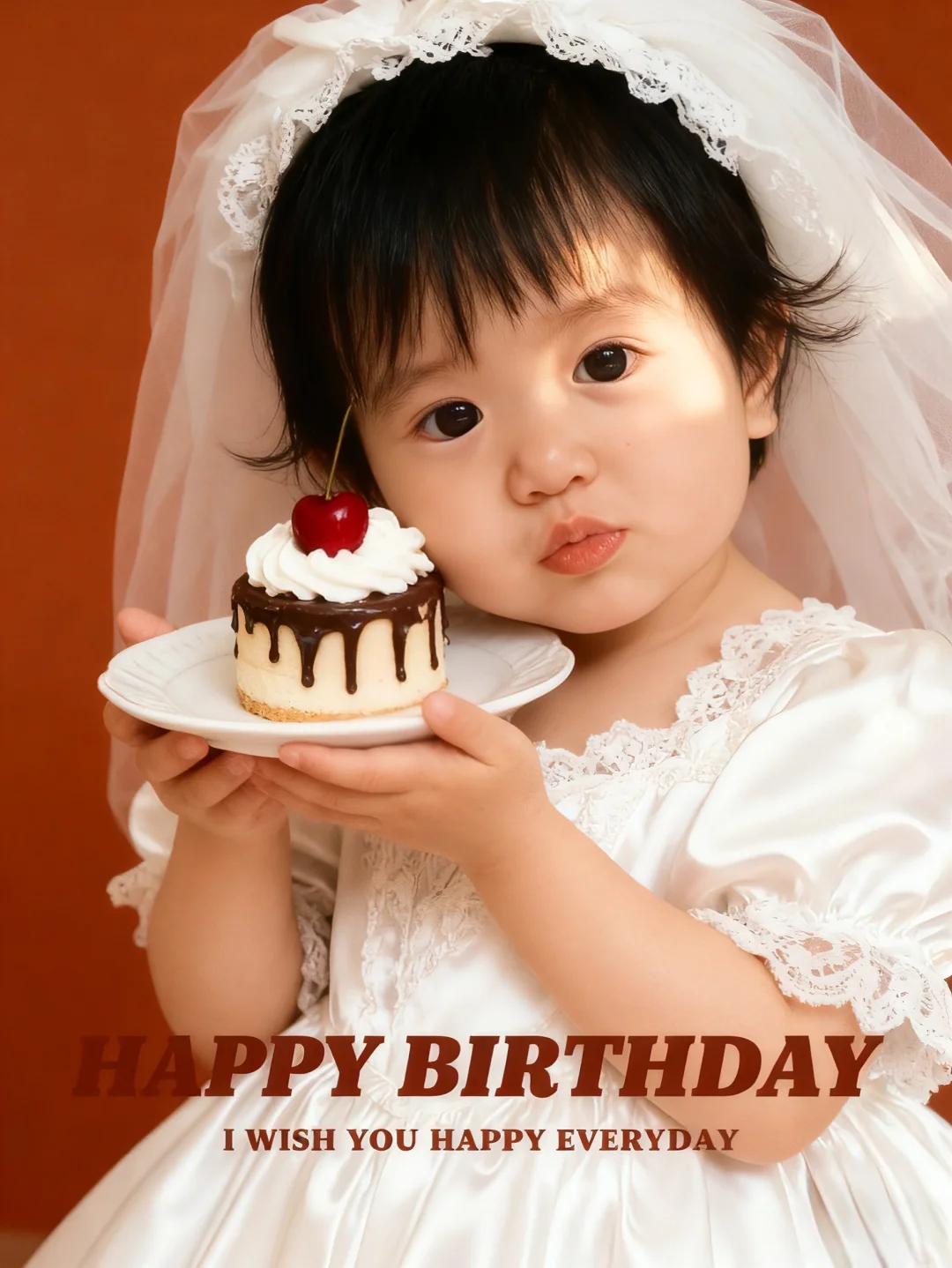 去除所有背景,保持脸不变,生成以复古昭和风为基调的宝宝生图6张,人物表情、动作、取景和角度丰富 ,尽量真实生动可爱,细节写实,如衣物的纹理,阳光的角度,装饰物的细节。画面呈现1980年代日系杂志封面质感,背景为深暖橙色。1岁宝宝留着挂耳短发,头戴白色头纱,身着白色缎面蕾丝复古小礼服,手持一款白瓷盘装着的装饰有1颗鲜红车厘子、白奶油,巧克力淋面的复古生日小蛋糕;画面融入英文“HAPPY BIRTHDAY”与英文“I WISH YOU HAPPY EVERYDAY” 的复古排版文字,整体色调是胶片质感的柔和复古色,营造出温馨治愈的怀旧写真氛围。比例 3:4。