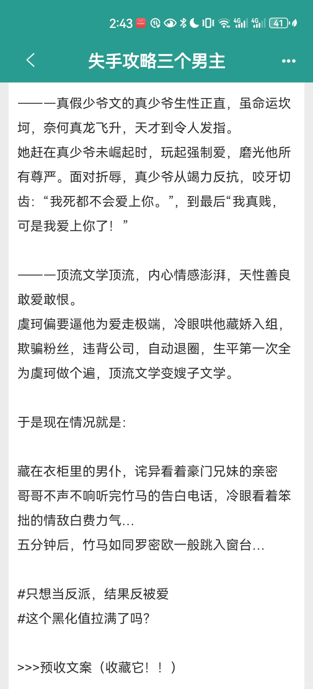这个超级好看,前面是女主和各个男主之间的拉扯,三个男主本来都对女主有敌意,但是仗不住女鹅又漂亮又可爱,知道自己喜欢上女主之后立马跟别的男人扯头花,意识流车车也很香最刺激的就是女主跟哥哥接吻,衣柜里面还藏着一个男人。