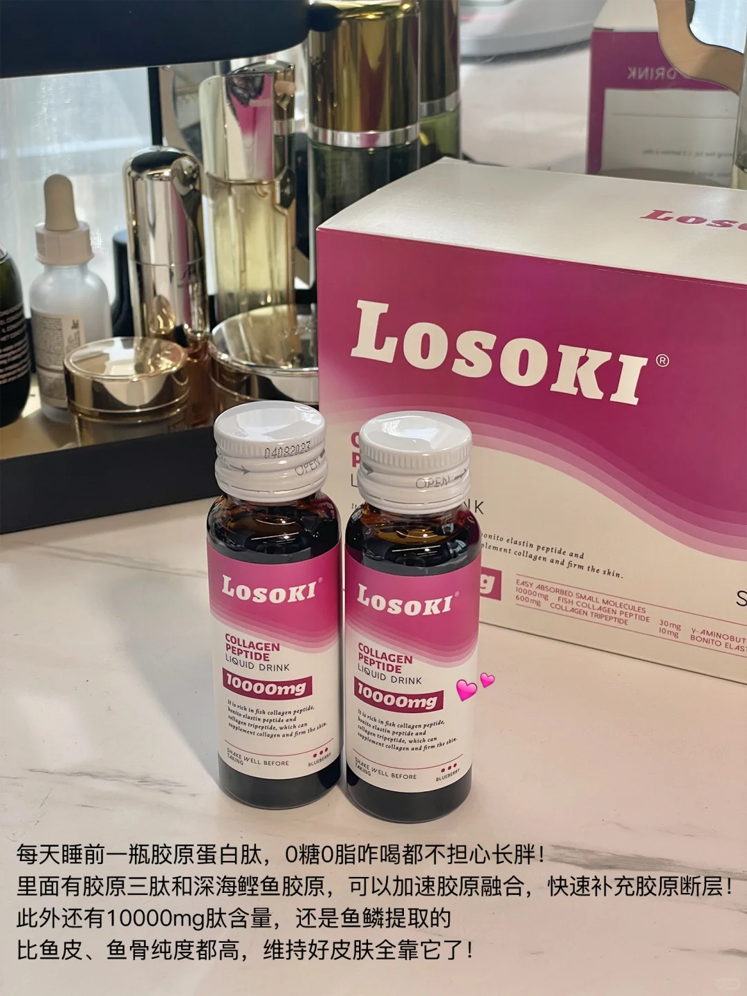 我现在喝的losoki 它每瓶浓缩10000mg鱼鳞提取的鱼胶原,纯度比其他都高,再加上胶原三肽和深海鲣鱼胶原的加持,实打实地把胶原补进去,