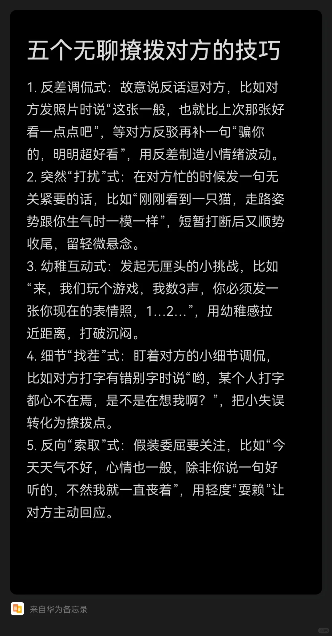 5. 反向“索取”式:假装委屈要关注,比如“今天天气不好,心情也一般,除非你说一句好听的,不然我就一直丧着”,用轻度“耍赖”让对方主动回应。