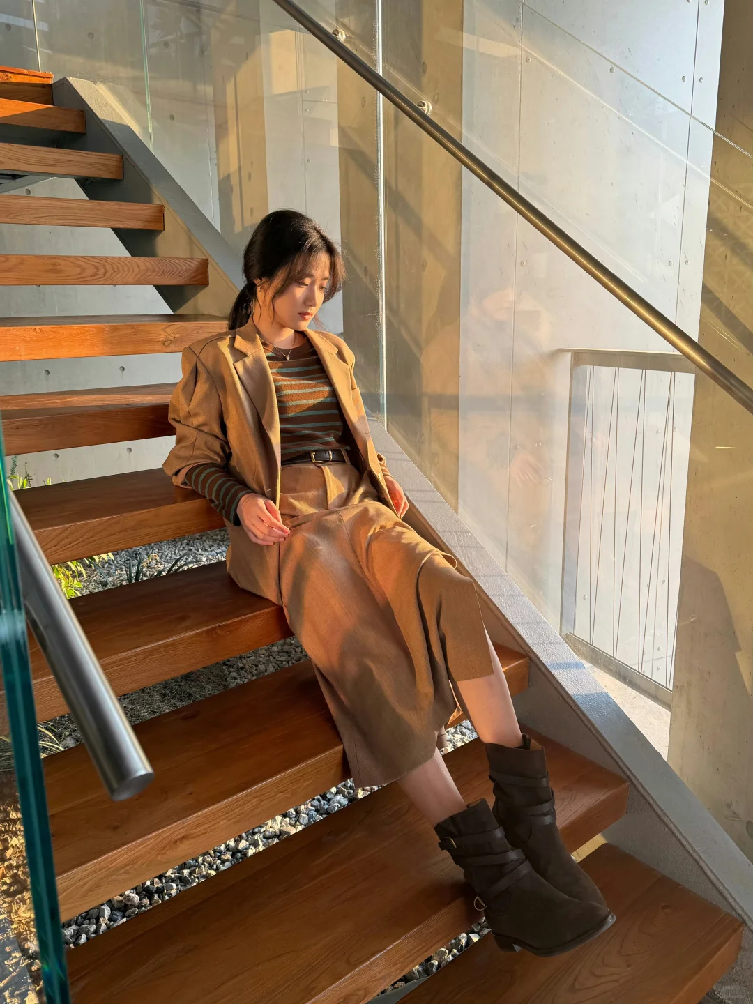 🔟:卡其色西装套装+条纹内搭+黑色短靴,职场通勤也能这么时髦,这套穿搭直接封神💼