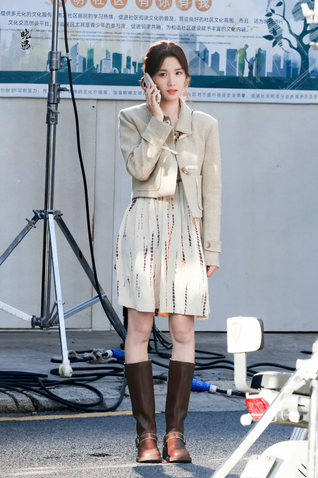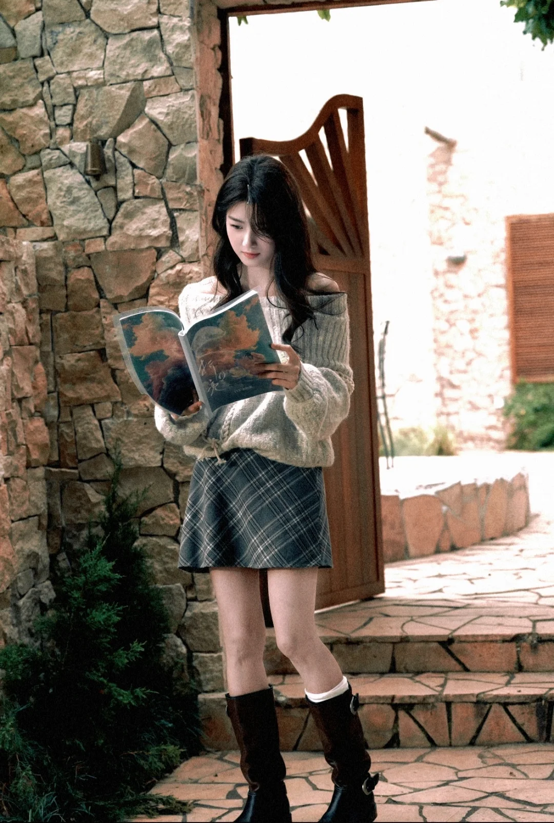 1️⃣:浅米色露肩针织衫+格纹短裙+棕色中筒靴,文艺感拉满,一整个温柔学姐既视感✨