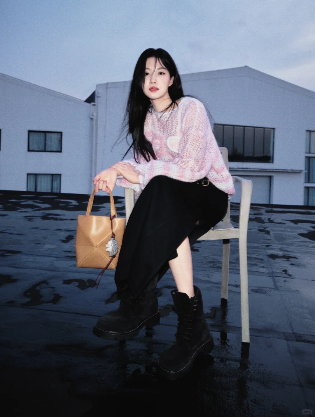 4️⃣:粉色镂空毛衣+黑色开叉裙+黑色马丁靴,甜酷少女风拿捏,这搭配出街回头率爆棚💥