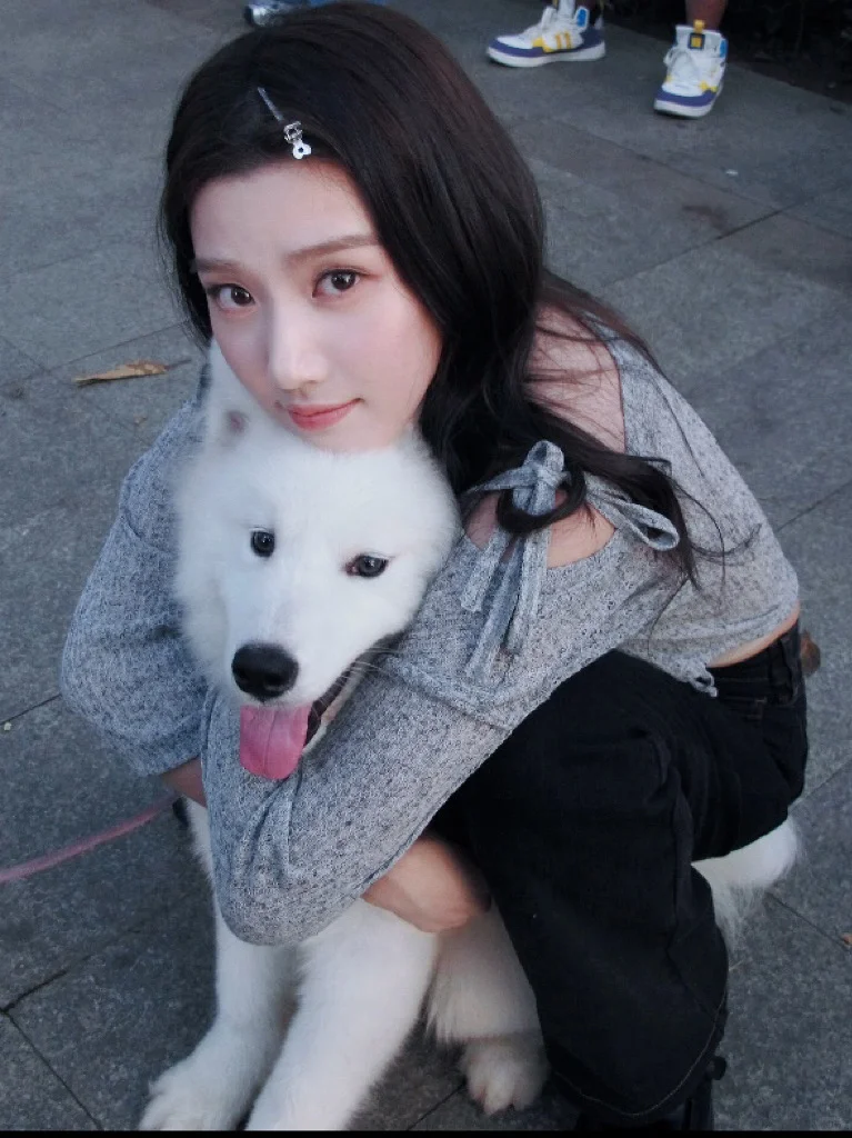 6️⃣:灰色露肩短款上衣+黑色长裤,甜辣感直接拉满,和修狗贴贴的穿搭也太吸睛了吧🐶