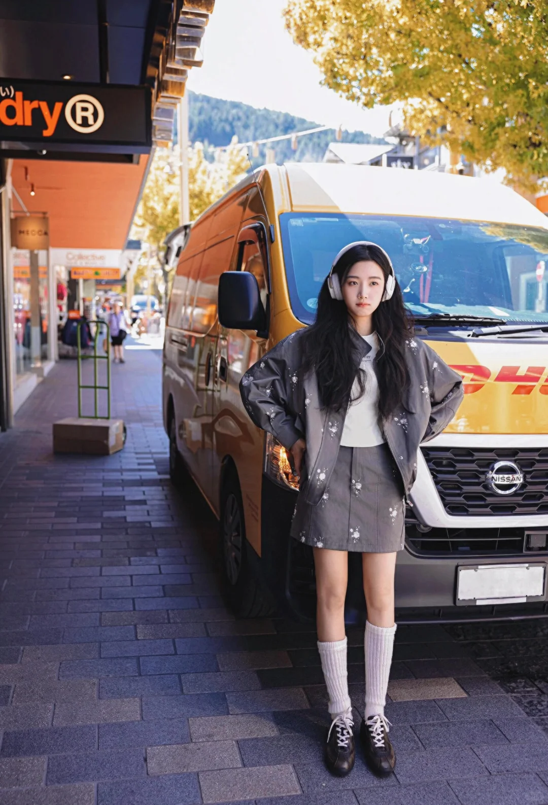 2️⃣:灰色碎花套装+白色耳机+黑色小皮鞋,街头甜酷风get,这穿搭也太有氛围感了吧🥰
