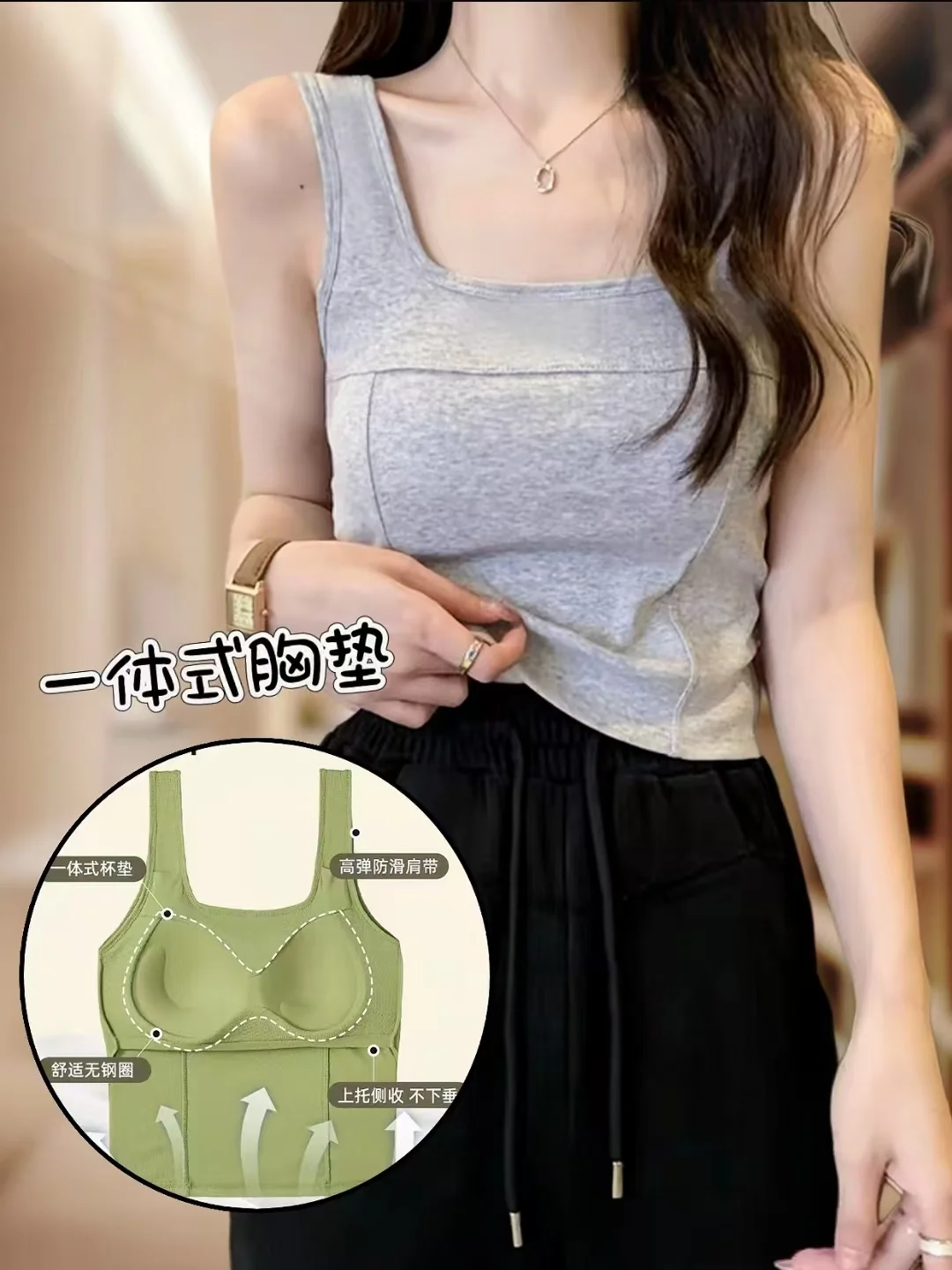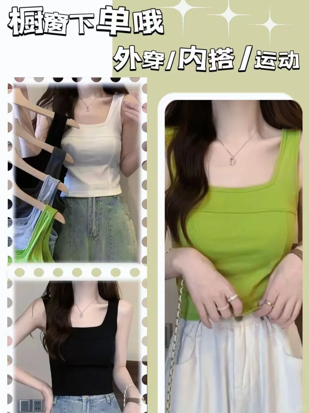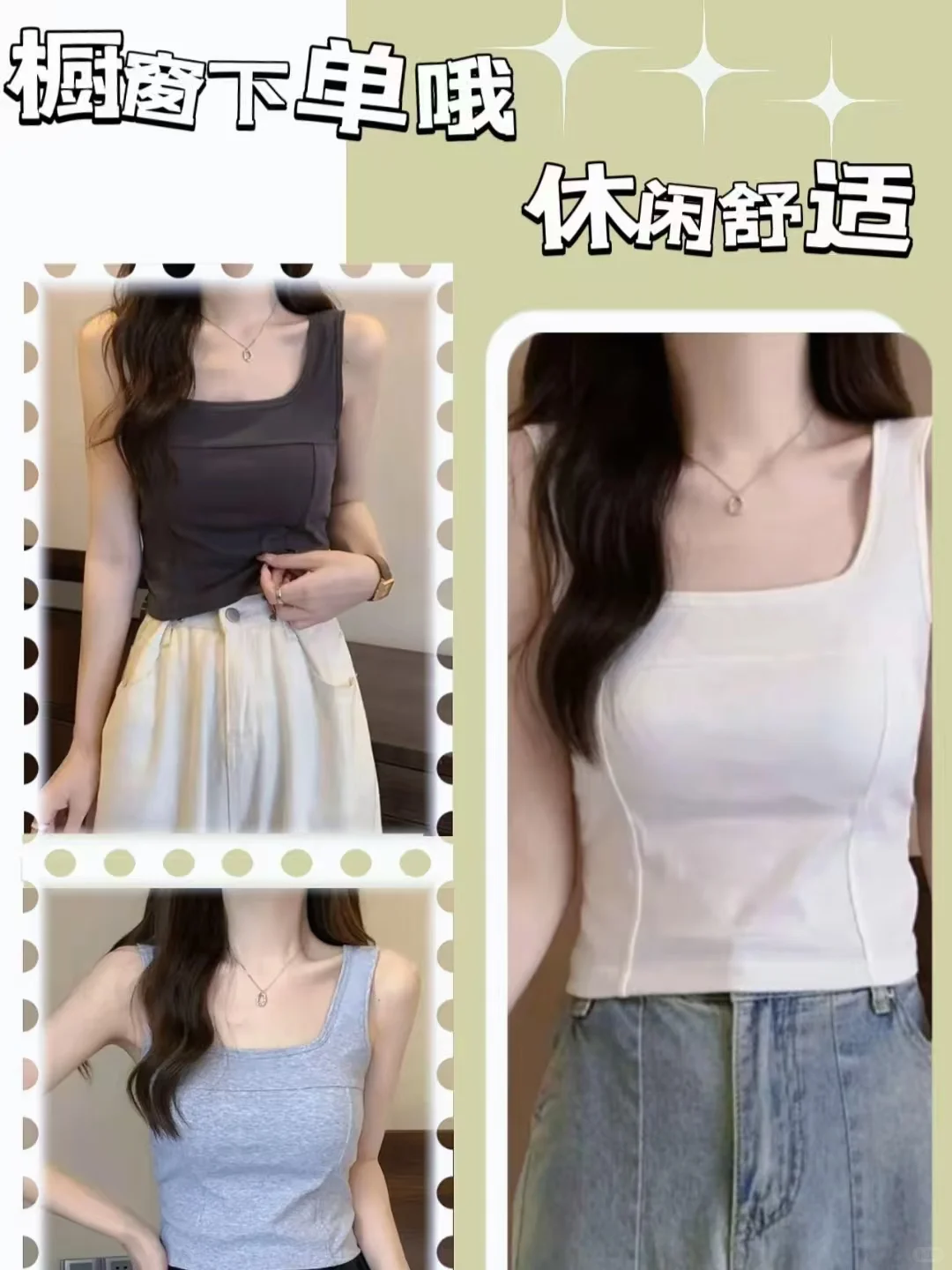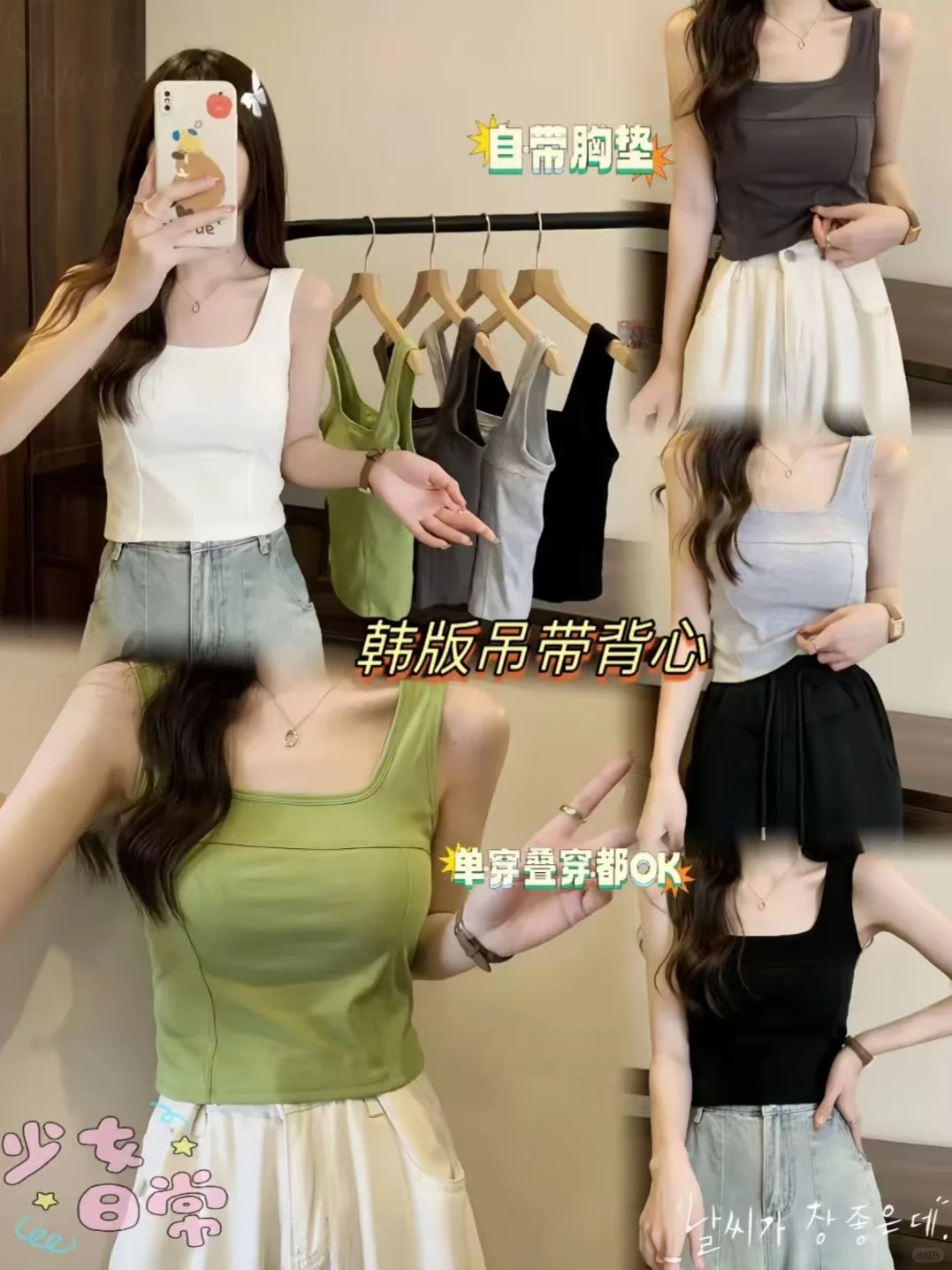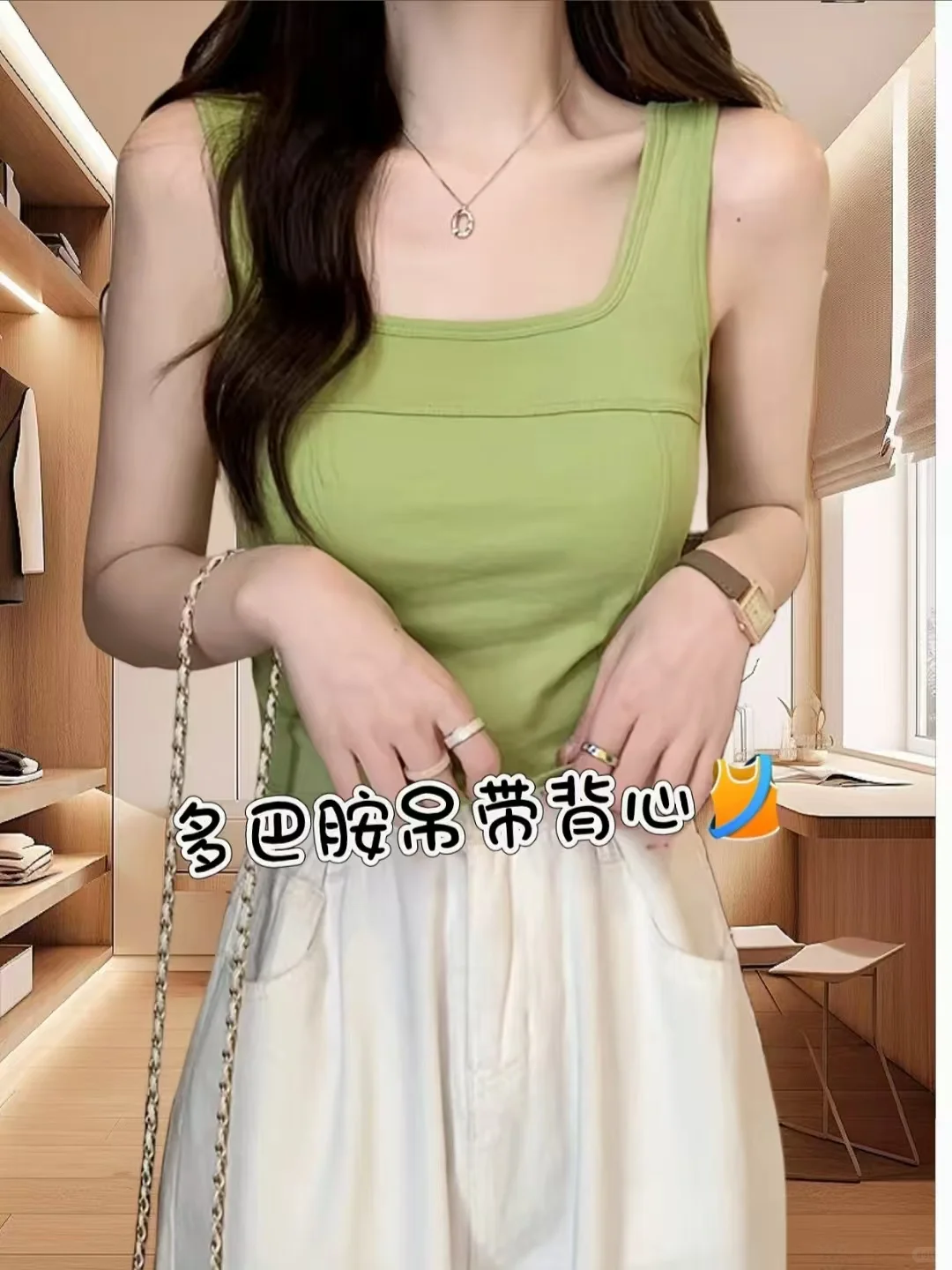 姐妹们,这款韩版吊带小背心,方领设计,简约时尚百搭,自带胸垫,内搭外穿网红吊带小背心均码,喜欢的姐妹放心冲吧~