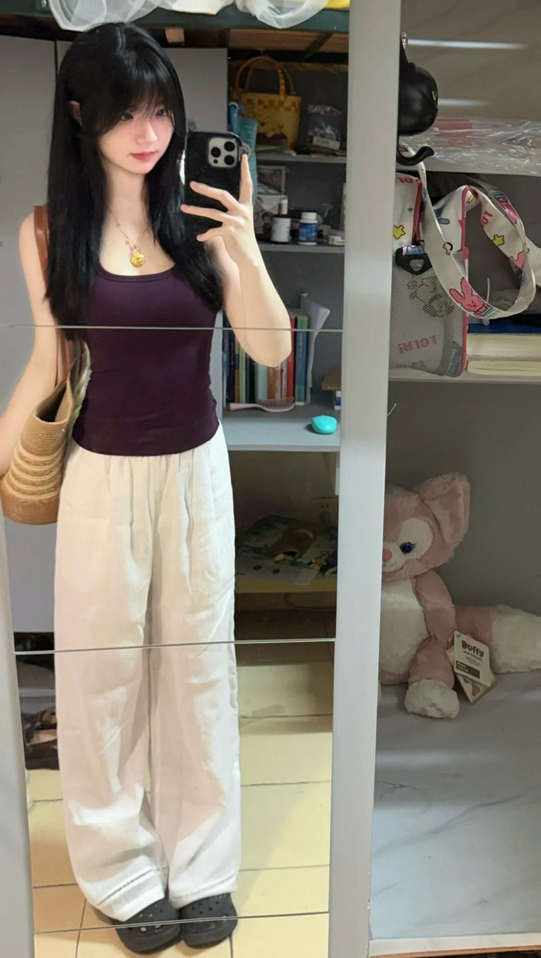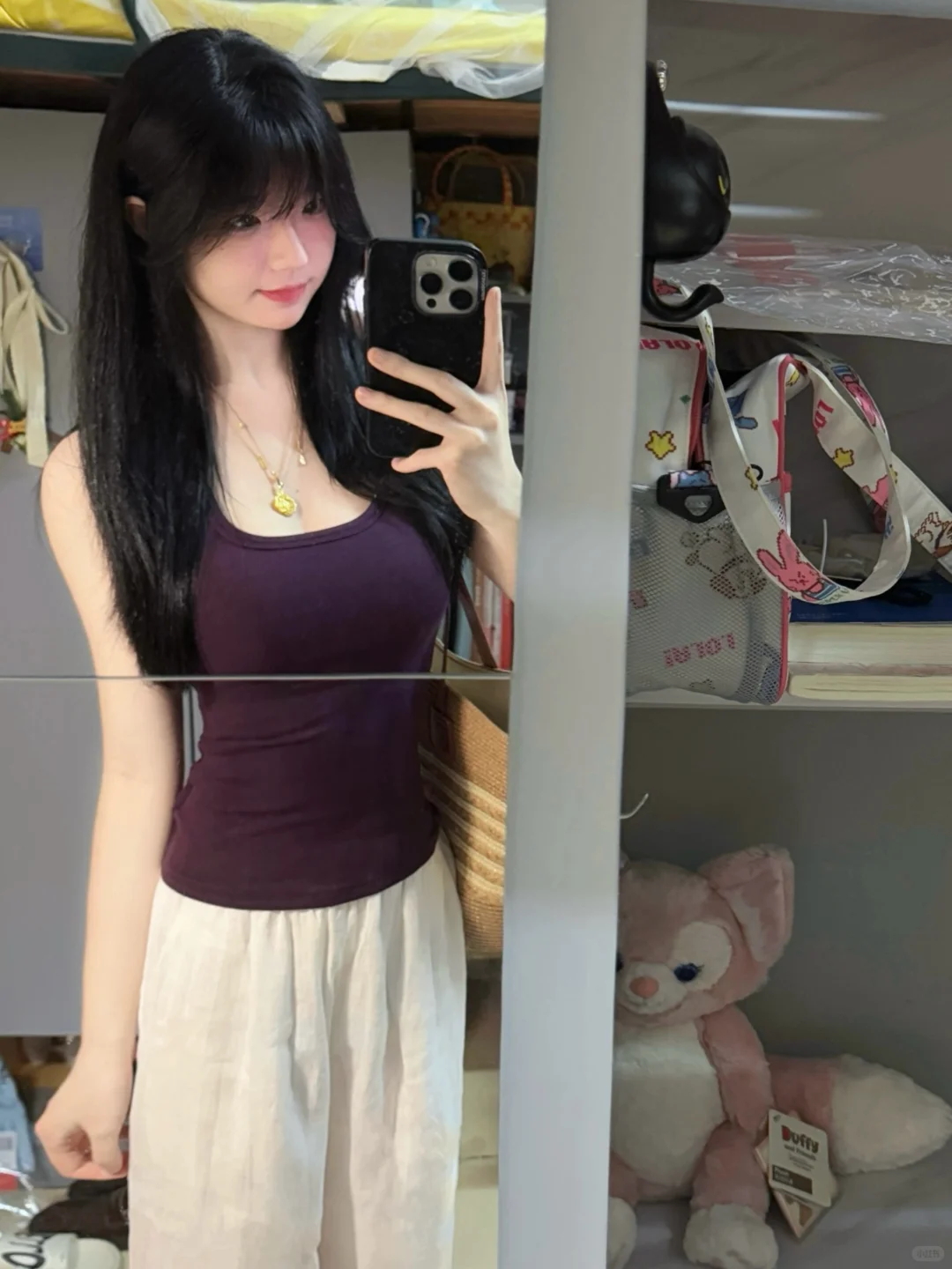宽松t恤不是特别瘦的宝宝穿反而会显得有点臃肿!!最近最爱的紫色吊带超级显白,自带的胸垫显得胸型很好看,加上软软棉麻裤,舒适的夏日慵懒氛围感