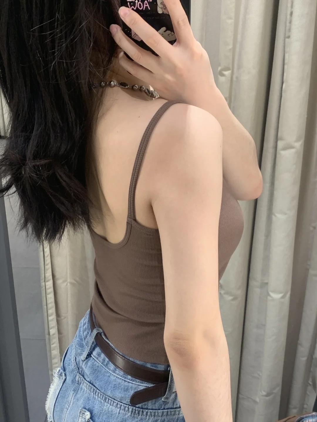 很特别的棕色很显白,而且自带胸垫!小胸也不会空杯,一体式大漏背设计,凉感科技面料很透气一点也不会闷。#我想穿所以我就穿了 #这件吊带我超爱 #辣妹吊带 #实现吊带自由 #吊带内搭 #好身材都是穿出来的