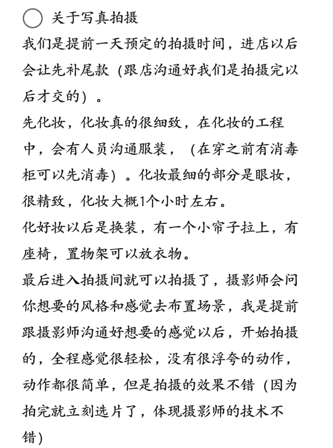 我们是提前一天预定的拍摄时间,进店以后会让先补尾款(跟店沟通好我们是拍摄完以后才交的)。