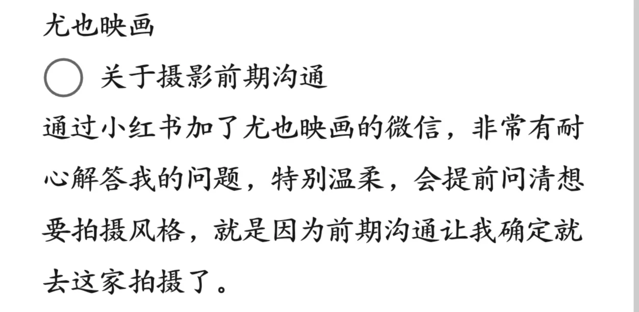 通过小红书加了尤也映画的微信,非常有耐心解答我的问题,特别温柔,会提前问清想要拍摄风格,就是因为前期沟通让我确定就去这家拍摄了。