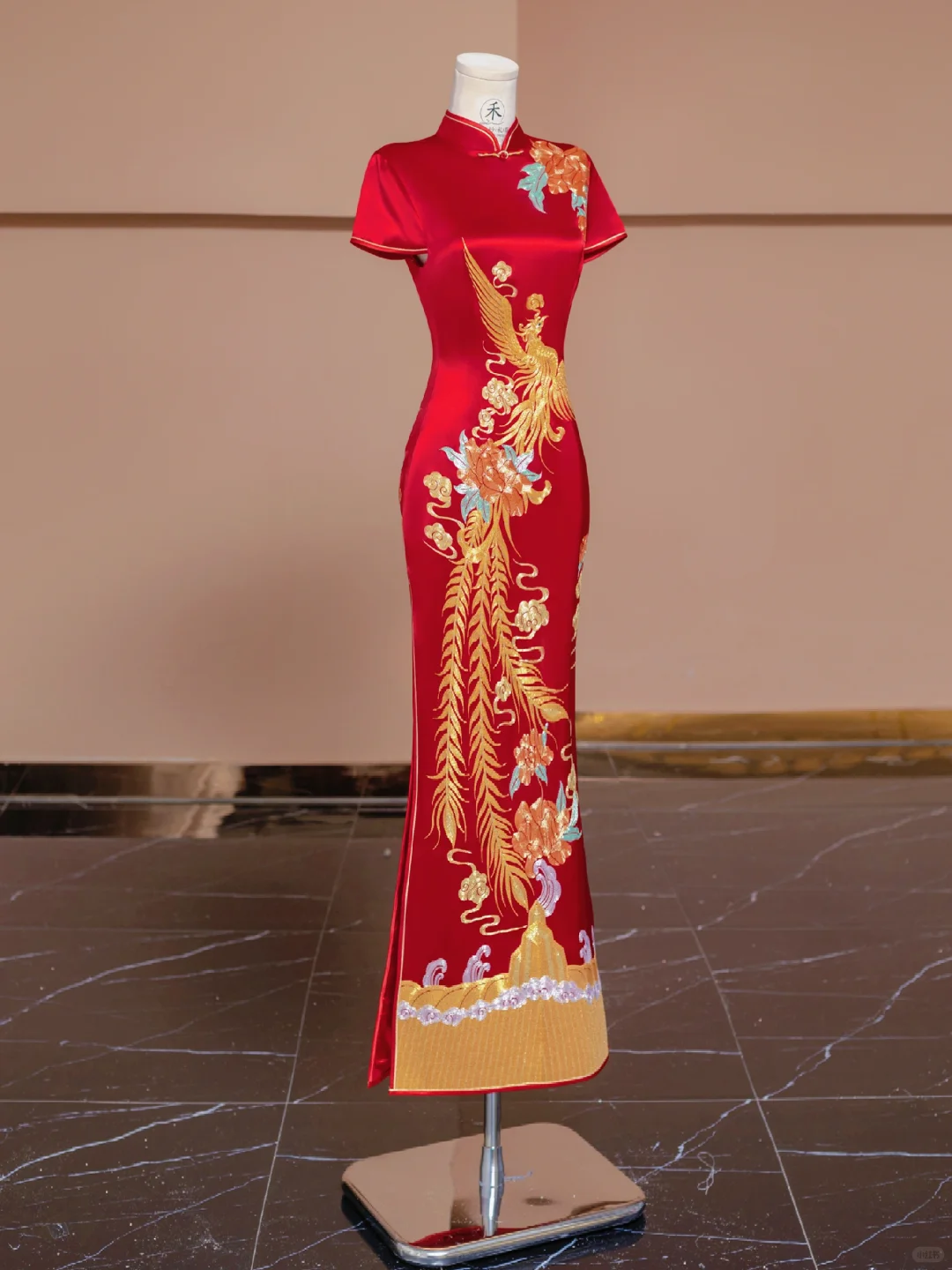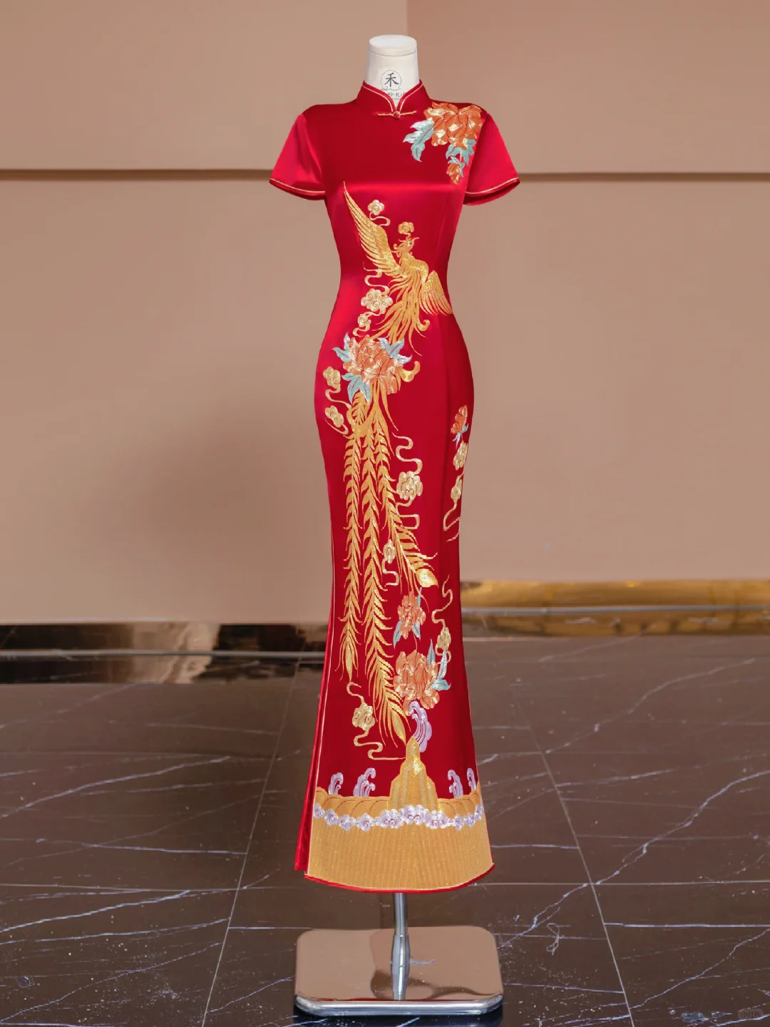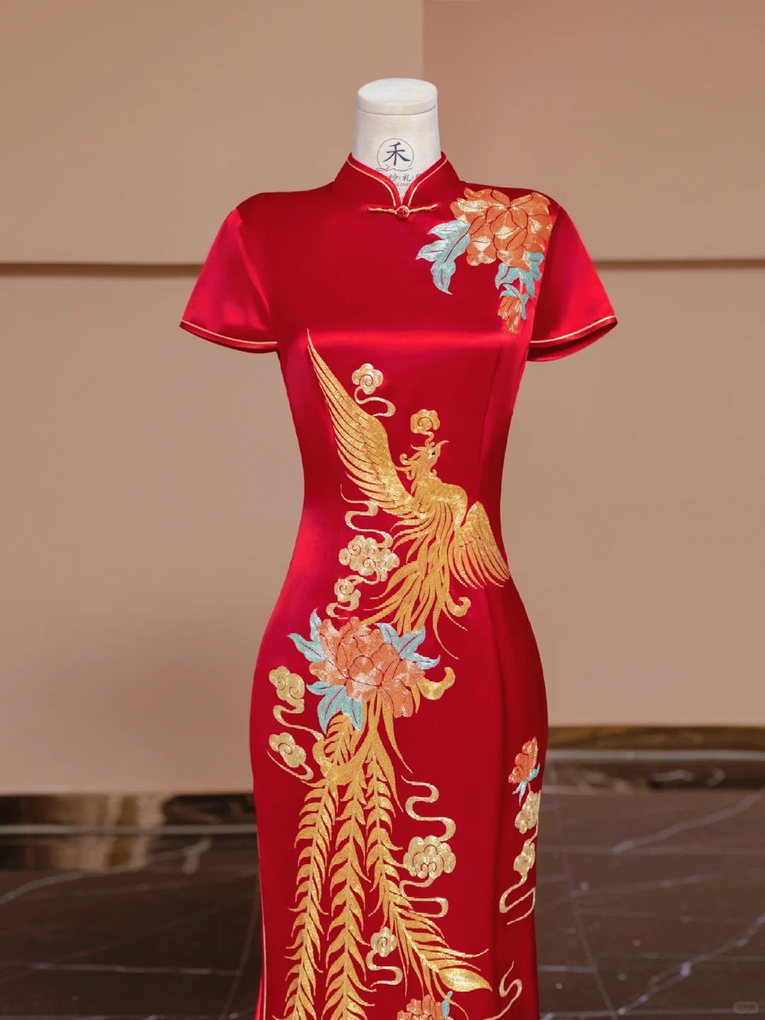 以红色的锦缎面料为底 ,重金刺绣的凤凰随身而上