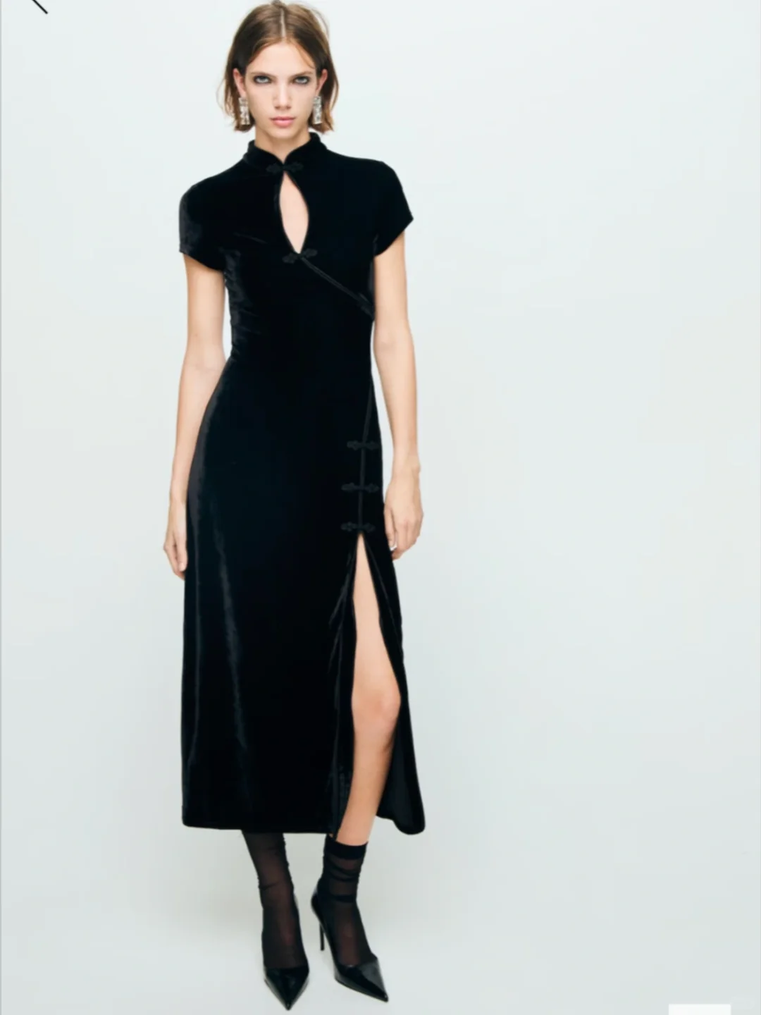 “天鹅绒面料。中长款设计。修身剪裁。立领。短袖。胸前圆形开口细节。裙摆侧开叉。盘扣闭合。”