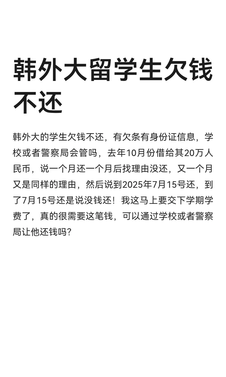 韩外大留学生欠钱不还