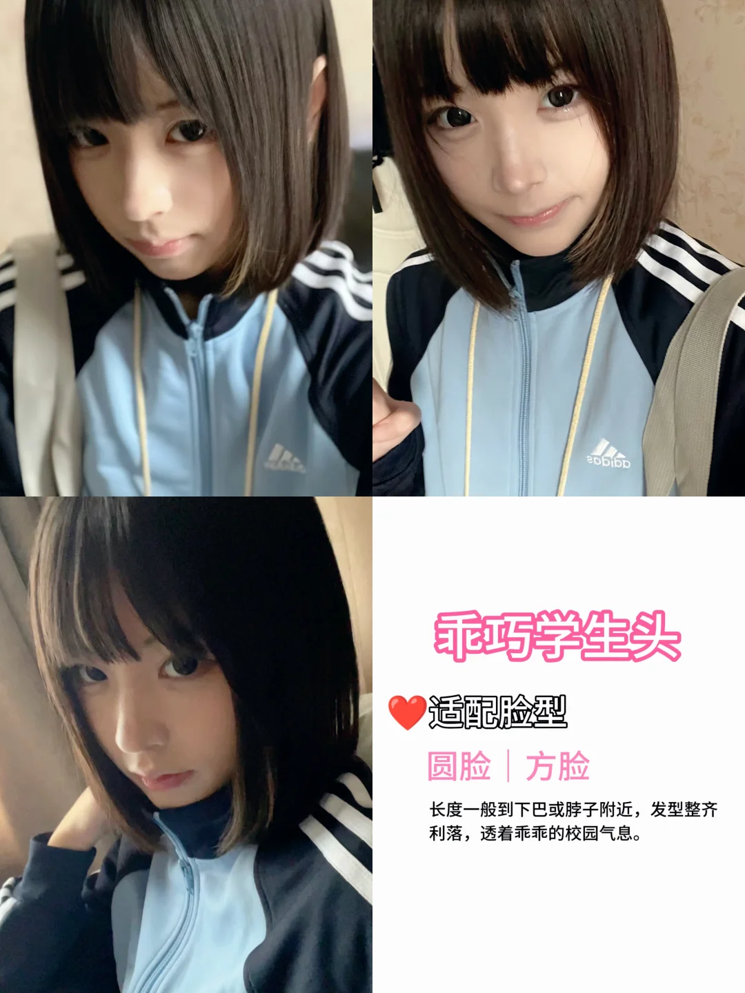 6. 乖巧学生头🍏发型整齐利落,透着乖乖的校园气息~适配圆脸、方脸,能让脸部更清秀;长脸避雷,会显脸更长。